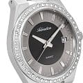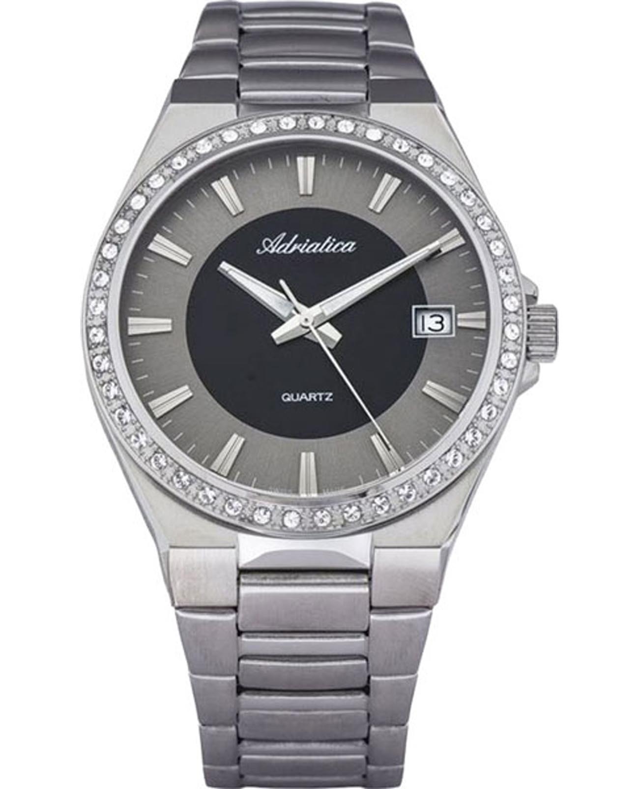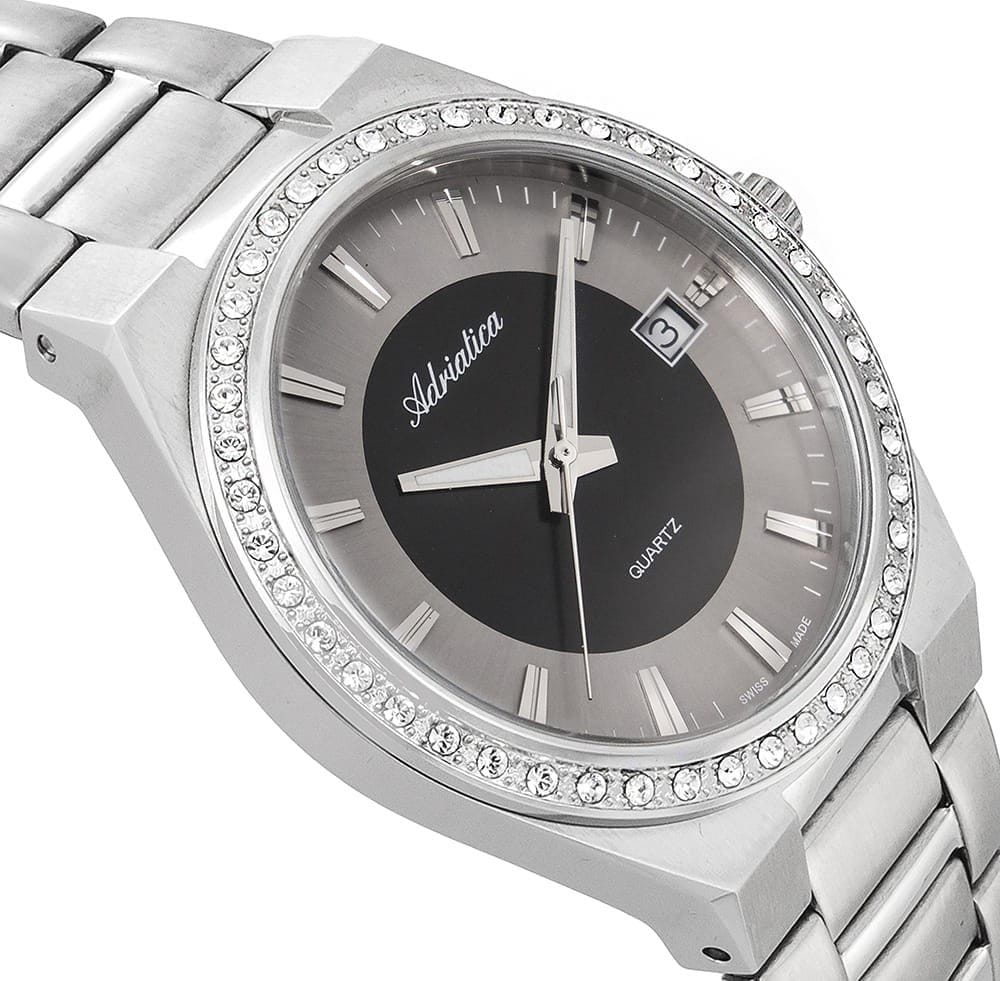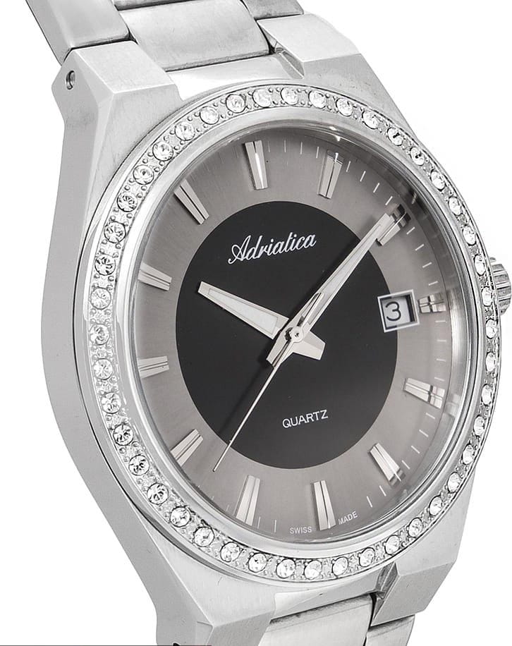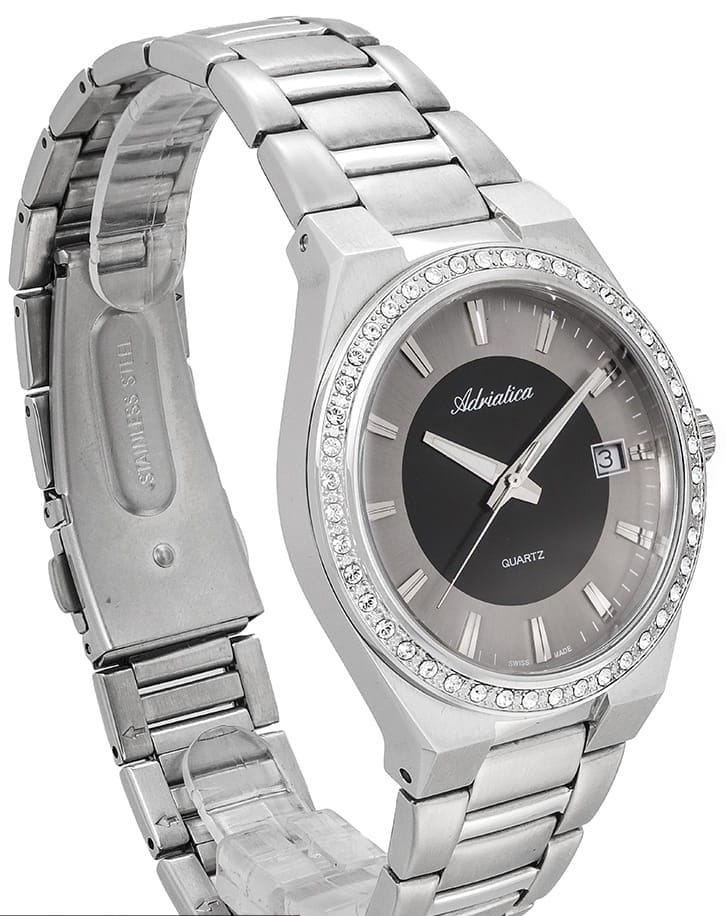 Женские швейцарские часы с минеральным стекломМинеральное стеклоМинеральное стекло представляет собой искусственно выращенный минерал кварца. Такое стекло отличается особой устойчивостью к повреждениям и царапинам. Уступает по некоторым качествам сапфировому стеклу. Adriatica A3804.5114QZ, кварцевый механизм, работающим от батарейки с высокой точностью. Класс водозащиты: 50 метров, позволит защитить корпус от случайных брызг или капель дождя. Корпус и браслет часов изготовлен из стали .Окошко даты находится в положении 3 часа.Стальной браслет на раскладной застёжкеРаскладная застёжкаТакой тип застёжки используется только на браслетах из металла. Она никогда не раскрывается полностью, происходит разделение на 2 и более частей. Раскладывающая застёжка снизит вероятность потери часов к минимуму.. Стрелки с люминесцентным покрытиемЛюминесцентное покрытиеПозволяет считывать показания времени в темноте. Производители наносят на стрелки, часовые индексы, безель или поверхность циферблата светонакопительный состав, дающий холодное свечение..БезельБезельВнешний ободок, закрепляющий стекло. В спортивных часах так называется поворотное кольцо с делениями на циферблате, выполняет роль таймера – замеряет отрезки времени на шкале. Неподвижный безель – элемент декора. Однонаправленно вращающийся безель на дайверских часах позволяет фиксировать моменты погружения и выныривания на поверхность. инкрустирован цирконами.