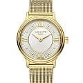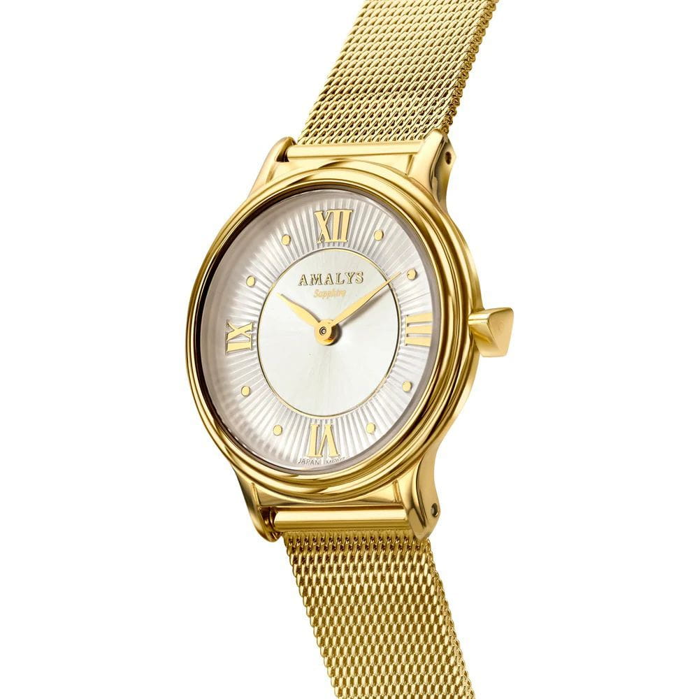 Amalys AMW-168 — женская модель с утончённым классическим дизайном, в которой сочетаются элегантность и практичность. Круглый корпус диаметром 28 мм выполнен из нержавеющей стали с PVD-покрытиемPVDУльтратонкое покрытие наносится в технике вакуумного напыления, сочетает в себе нитрид титана особой прочности со слоем золота или оксида хрома. Несёт в себе декоративную или защитную функцию., гармонирующим с браслетом шириной 14 мм в том же исполнении. Защитную функцию выполняет сапфировое стеклоСапфировое стеклоПрочный и надёжный материал из кристалла сапфира синтетического происхождения, характеризующийся особой твёрдостью и устойчивостью к царапинам и повреждениям., стойкое к царапинам и сохраняющее прозрачность. Механизм — кварцевый, обеспечивающий точность и стабильность хода. Браслет миланского плетения с PVD-покрытиемPVDУльтратонкое покрытие наносится в технике вакуумного напыления, сочетает в себе нитрид титана особой прочности со слоем золота или оксида хрома. Несёт в себе декоративную или защитную функцию. снабжён раскладным замкомРаскладной замокДанный вариант застежки используется только на часах с металлическим браслетом. Отличительная особенность такого крепления в том, что длина браслета становится универсальной и вы можете самостоятельно отрегулировать нужный вам размер – застежка просто двигается по браслету часов., который сочетает надёжность фиксации и удобство повседневного использования. Водозащита 5 ATM защищает часы от случайных брызг и дождя. Циферблат с римскими индексами и изящными стрелками подчёркивает классическую эстетику модели, делая её уместной как в повседневных образах, так и в торжественной обстановке.