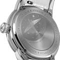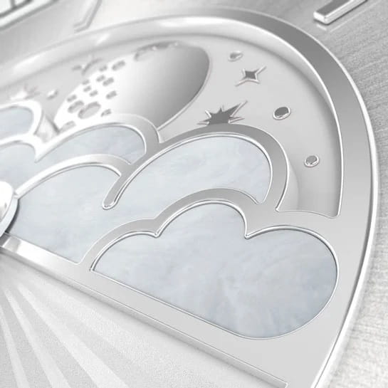 Циферблат в стиле Art Deco украшает усложнение фаз Луны в верхней половине, обрамлённой тонким кольцом облаков. Отмечено окно даты в положении «6 часов». Стрелки и накладные метки обработаны люминесцентным покрытиемЛюминесцентное покрытиеПозволяет считывать показания времени в темноте. Производители наносят на стрелки, часовые индексы, безель или поверхность циферблата светонакопительный состав, дающий холодное свечение. Superluminova — для уверенного считывания в темноте. Поверхность защищена сапфировым стекломСапфировое стеклоПрочный и надёжный материал из кристалла сапфира синтетического происхождения, характеризующийся особой твёрдостью и устойчивостью к царапинам и повреждениям. с антибликовым покрытием.