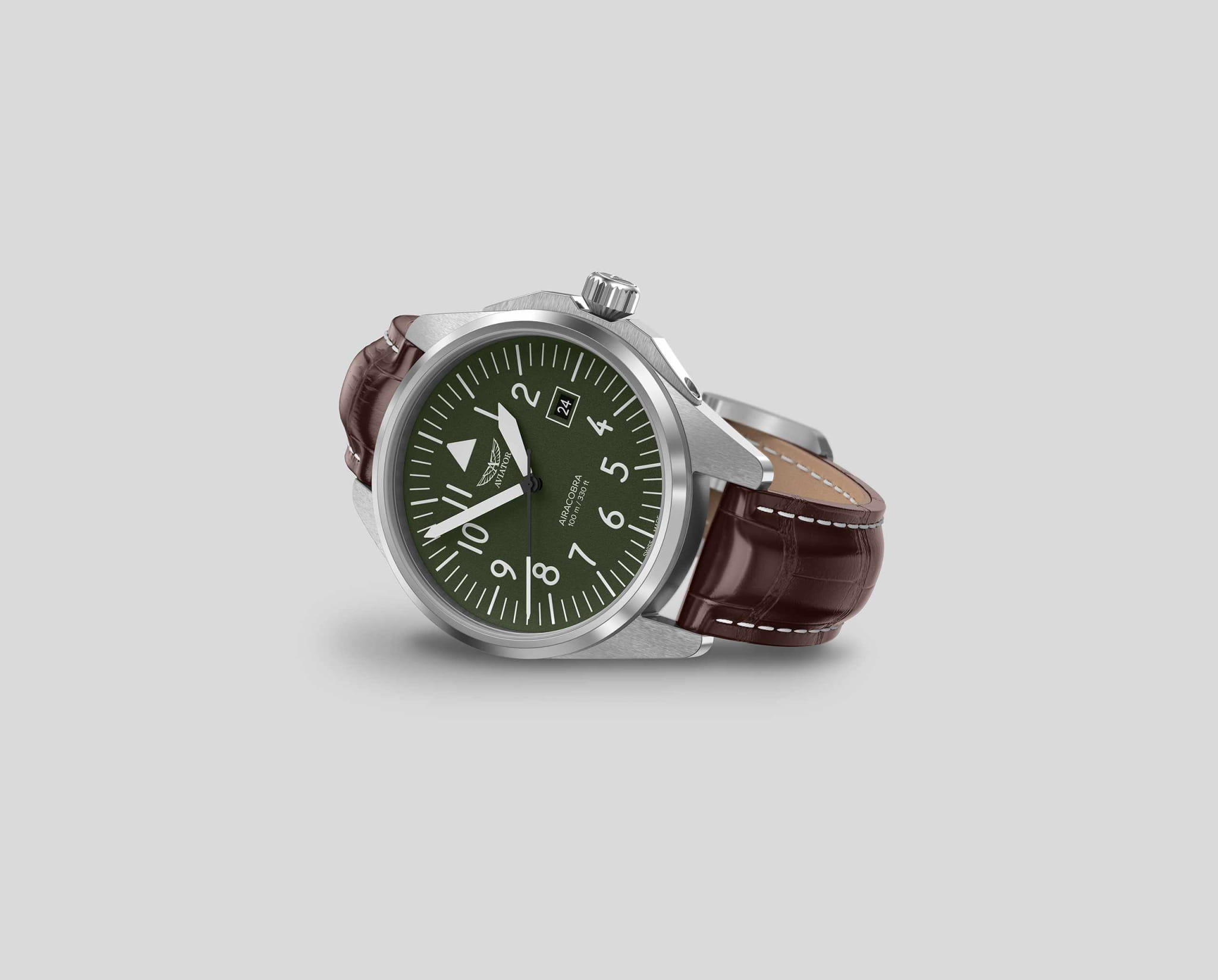 Aviator V.1.38.0.319.4 “Airacobra 43 Type A” — надёжные швейцарские пилотские часы с насыщенным функционалом и строгим авиационным дизайном. Корпус диаметром 42,8 мм выполнен из нержавеющей стали.