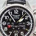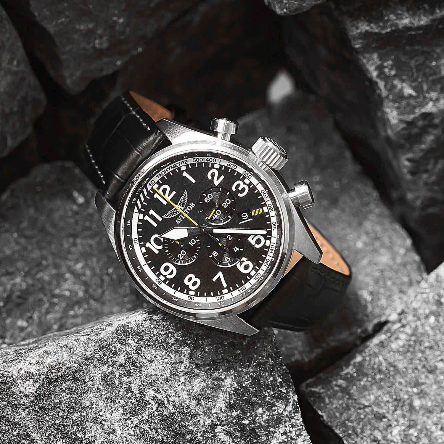 Aviator Airacobra V.2.25.0.169.4 — швейцарский GMT-хронограф в духе пилотских инструментов, объединяющий точность, удобство и лаконичный дизайн. Диаметр корпуса — 45 мм, выполнен из нержавеющей стали, что подчёркивает техническую надёжность в образе часов.