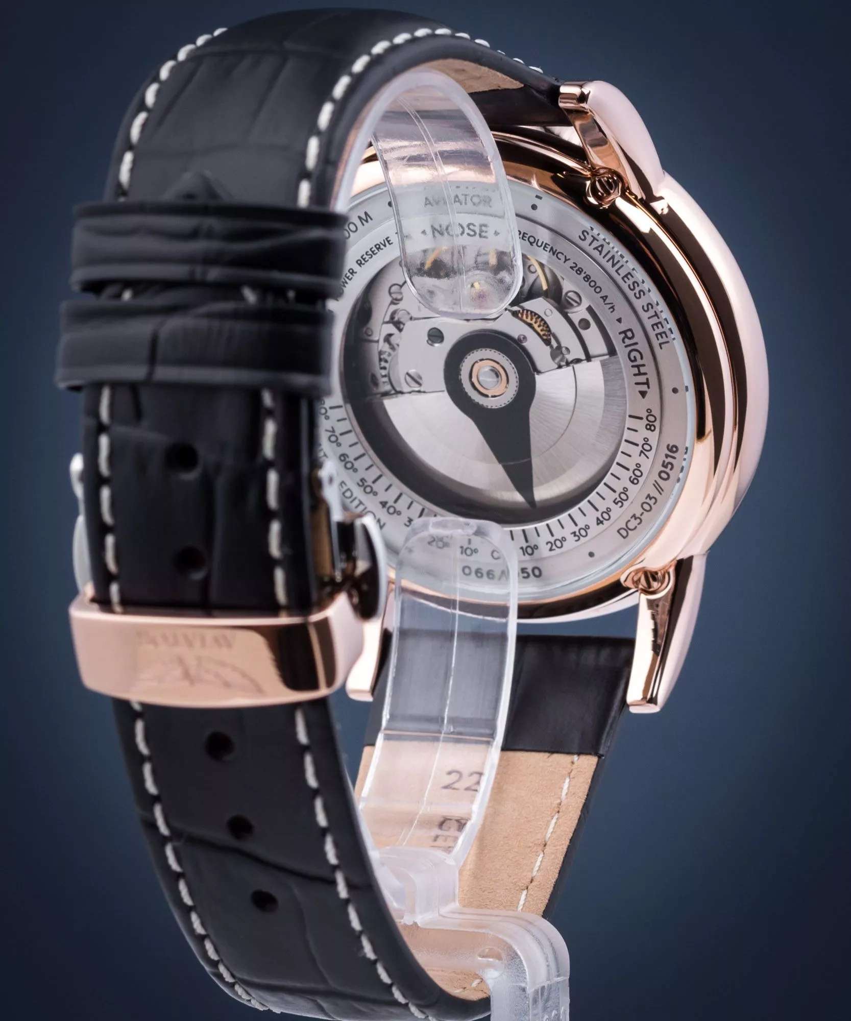 Aviator Douglas DC-3 V.3.32.2.242.4 — швейцарские часы в классике авиадизайна, сочетающие безупречную читаемость и высокую надёжность. Лимитированная серия. Корпус диаметром 45 мм выполнен из нержавеющей стали 316L с PVD-покрытиемPVDУльтратонкое покрытие наносится в технике вакуумного напыления, сочетает в себе нитрид титана особой прочности со слоем золота или оксида хрома. Несёт в себе декоративную или защитную функцию. цвета розового золота. Накладные метки выполнены в виде штрихов. Окошко даты находится в положении 6 часов. Часовые метки и стрелки покрыты люминесцентным покрытиемЛюминесцентное покрытиеПозволяет считывать показания времени в темноте. Производители наносят на стрелки, часовые индексы, безель или поверхность циферблата светонакопительный состав, дающий холодное свечение. Superluminova, позволяющим легко определять время даже в тёмное время суток. Поверхность защищена прочным сапфировым стекломСапфировое стеклоПрочный и надёжный материал из кристалла сапфира синтетического происхождения, характеризующийся особой твёрдостью и устойчивостью к царапинам и повреждениям. с антибликовым покрытием, устойчивым к царапинам. Сердце модели — швейцарский механизм Sellita SW 200, известный своей точностью и долговечностью. Водозащита 100 метров, позволит плавать, нырять и заниматься другими водными видами спорта. Завинчивающаяся головка и задняя крышка обеспечивают уверенную ударопрочностьУдаропрочный корпусМеханизм заключён в корпус, выполненный из современных материалов, устойчивых к ударам, механическим повреждениям и падению с высоты: инновационный пластик, карбон, нержавеющая сталь, титан. и надёжную защиту от влаги и пыли. В механизме 26 камней, запас хода 38 часов. Модель дополнена кожаным ремешком с выразительной текстурой и классическим стилем, закреплённым с помощью застёжке-бабочке с кнопкамиЗастёжка "бабочка"Такой вид застёжки дополняется предохранителями, помогающими избежать случайного раскрытия браслета. Обладают изящным исполнением. — для максимального комфорта и лёгкости в повседневном использовании. Циферблат выполнен по технологии sun-ray (солнечные лучи). Коллекция Douglas была разработана в честь известного американского пассажирского самолета Douglas DC-3. Aviator — это образец лётной точности, инженерной чёткости и сдержанной роскоши, идеально подходящий для тех, кто ценит функциональность и уверенность в каждом элементе.