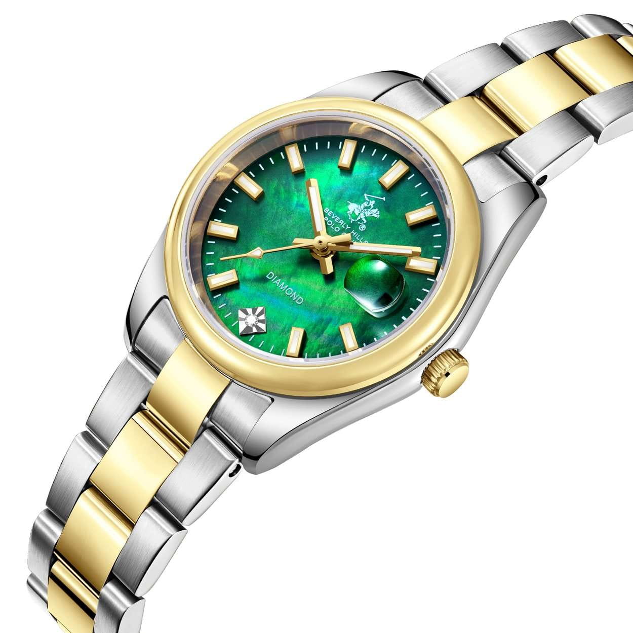 Американские женские часы Beverly Hills Polo Club BP3794X.270 - это стильный женский аксессуар, который сочетает элегантный дизайн и практичность. Корпус выполнен из нержавеющей стали серебристого цвета, диаметром 34,5 мм, что обеспечивает долговечность и утончённый внешний вид. Надежное минеральное стеклоМинеральное стеклоМинеральное стекло представляет собой искусственно выращенный минерал кварца. Такое стекло отличается особой устойчивостью к повреждениям и царапинам. Уступает по некоторым качествам сапфировому стеклу. с сапфировым покрытием защищает циферблат от царапин и обеспечивает долговечность. Метки в виде штрихов, в позиции "6 часов" инкрустирован синтетический бриллиант. Неподвижный безельБезельВнешний ободок, закрепляющий стекло. В спортивных часах так называется поворотное кольцо с делениями на циферблате, выполняет роль таймера – замеряет отрезки времени на шкале. Неподвижный безель – элемент декора. Однонаправленно вращающийся безель на дайверских часах позволяет фиксировать моменты погружения и выныривания на поверхность. с IP-покрытиемIP-покрытиеМетод ионного напыления. Демонстрирует повышенную устойчивость к истиранию, окислению и химическим веществам. Под воздействием высокого давления и температуры около 1500°C молекулы металла надёжно соединяются с частицами корпуса часов. золотистого цвета. Модель оснащена кварцевым механизмом, обеспечивающим высокую точность хода. Стальной браслет с частичным IP-покрытиемIP-покрытиеМетод ионного напыления. Демонстрирует повышенную устойчивость к истиранию, окислению и химическим веществам. Под воздействием высокого давления и температуры около 1500°C молекулы металла надёжно соединяются с частицами корпуса часов. на застёжке-бабочке с кнопкамиЗастёжка "бабочка"Такой вид застёжки дополняется предохранителями, помогающими избежать случайного раскрытия браслета. Обладают изящным исполнением. обеспечивает комфортное ношение. Стрелки и метки оснащены люминесцентным покрытиемЛюминесцентное покрытиеПозволяет считывать показания времени в темноте. Производители наносят на стрелки, часовые индексы, безель или поверхность циферблата светонакопительный состав, дающий холодное свечение., обеспечивающим отличную видимость даже при слабом освещении. Окошко даты находится в положении 3 часа. Водозащита 30 метров позволит защитить корпус от случайных брызг или капель дождя. Эта модель – отличный выбор для тех, кто ищет сочетание стиля, качества и функциональности. Часы станут не только полезным аксессуаром, но и выразительным элементом вашего имиджа.