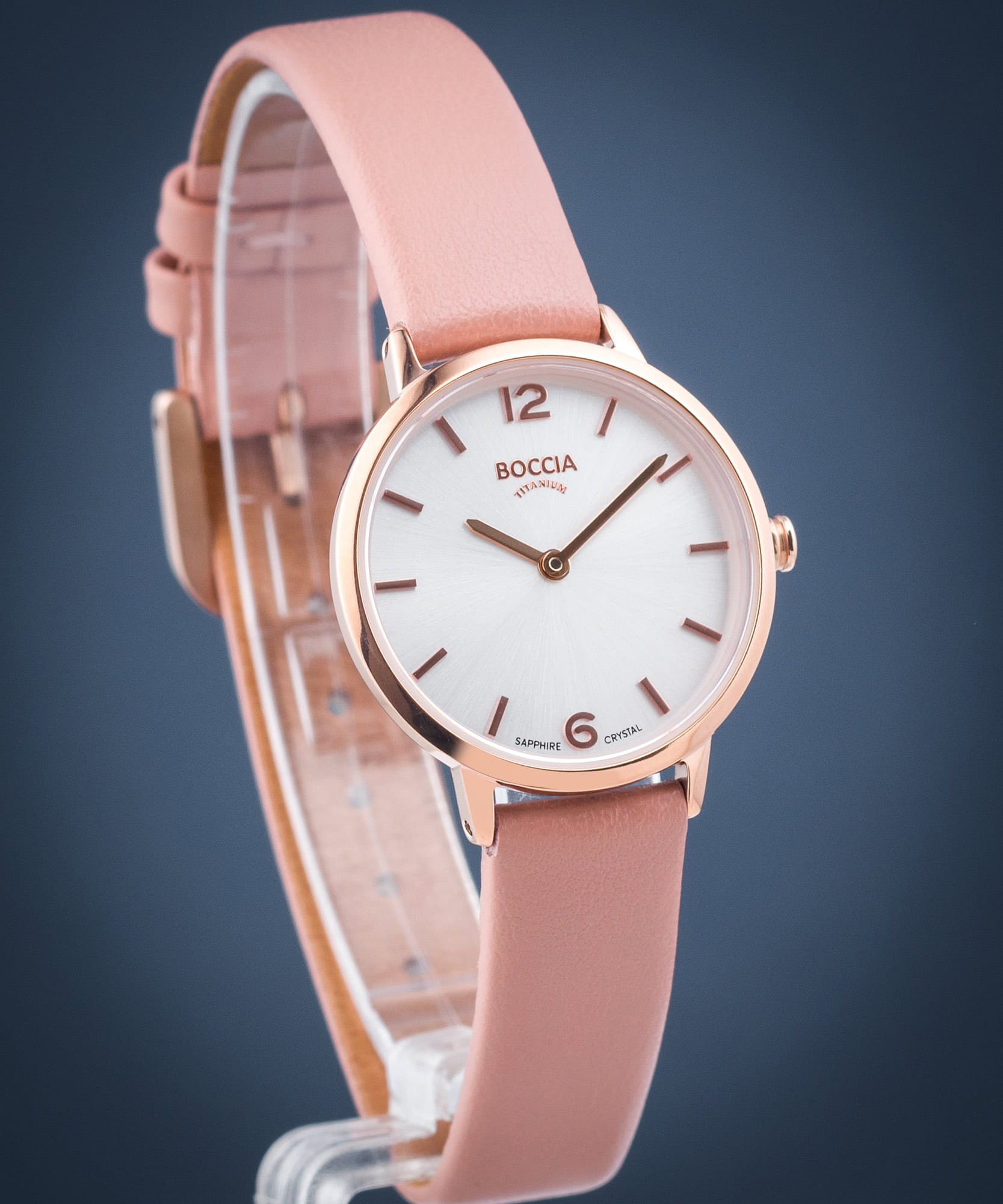 Женские немецкие титановые часы Boccia Titanium Circle-Oval 3345-04, кварцевый механизм с высокой точностью.Сапфировое стеклоСапфировое стеклоПрочный и надёжный материал из кристалла сапфира синтетического происхождения, характеризующийся особой твёрдостью и устойчивостью к царапинам и повреждениям. устойчивое к мелким механическим повреждениям. Корпус изготовлен из титана c PVDPVDУльтратонкое покрытие наносится в технике вакуумного напыления, сочетает в себе нитрид титана особой прочности со слоем золота или оксида хрома. Несёт в себе декоративную или защитную функцию. покрытием. Метки в виде штрихов двух арабских цифр. Класс водозащиты: 50 метров, позволит защитить корпус от случайных брызг или капель дождя. Кожаный ремешок на стандартной застёжке.