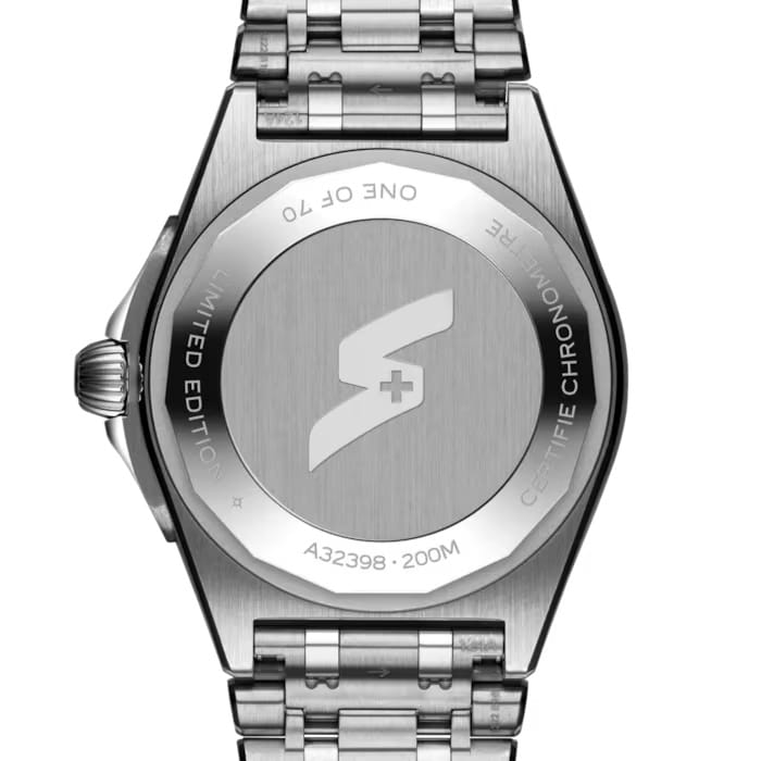 Мужские швейцарские часы Breitling Chronomat Automatic GMT 40 Sporthilfe Limited Edition A323982C1L1A1 механический механизм (автоматический калибр) с высокой точностью. Часы Chronomat Automatic GMTGMTОтображение времени второго часового пояса.Такая функция особенно актуальна для путешественников и бизнесменов,которые общаются с людьми из разных стран,теперь вы всегда будете знать,какой час у вашего партнёра или близкого человека. 40 - это дань уважения Breitling путешествиям не только благодаря дисплею с двумя часовыми поясами, но и благодаря своей непринужденной эстетике. 24-часовая шкала позволяет пользователю отслеживать второй часовой поясВторой часовой поясФункция, позволяющая отображать время двух часовых поясов одновременно. и с первого взгляда определять, день сейчас или ночь, а заводная головка “луковица” (классическая функция хронометра, получившая название из-за своей рифленой формы купола) позволяет легко регулировать время. Сапфировое стеклоСапфировое стеклоПрочный и надёжный материал из кристалла сапфира синтетического происхождения, характеризующийся особой твёрдостью и устойчивостью к царапинам и повреждениям. с антибликовым покрытиемАнтибликовое покрытиеСлой оксида металла в 0,13-0,3 микрон, благодаря которому стекло часов не бликует и не отражает свет. Антибликовое покрытие уменьшает отражение света в 10 раз, обеспечивая отличную читаемость показателей циферблата. устойчивое к появлению царапин, обладающее высокой прозрачностью. Класс водозащиты: 200 метров, позволит плавать, нырять и заниматься другими водными видами спорта. Корпус часов изготовлен из нержавеющей стали, диаметром 40 мм. Стальной браслет на застёжке-бабочке с кнопкамиЗастёжка "бабочка"Такой вид застёжки дополняется предохранителями, помогающими избежать случайного раскрытия браслета. Обладают изящным исполнением. обеспечивает комфортное ношение. Часы имеют сертификат COSCСертификат COSCОфициальный сертификат, подтверждающий то, что часы ходят с особо высокой точностью. Для получения документа часы подвергаются тестовым испытаниям, разработанным швейцарским институтом тестирования хронометров COSC. Допустимая норма для механических часов -4/+6 секунд в день, для кварцевых моделей +/- 0,07 секунд в день., запас хода примерно 42 часа. Стрелки и метки с люминесцентным покрытиемЛюминесцентное покрытиеПозволяет считывать показания времени в темноте. Производители наносят на стрелки, часовые индексы, безель или поверхность циферблата светонакопительный состав, дающий холодное свечение.. Окошко даты находится в положении 6 часов. Известные как “часы на все случаи жизни”, часы Chronomat сейчас актуальны как никогда благодаря практичным размерам GMT 40 и сдержанному стилю.