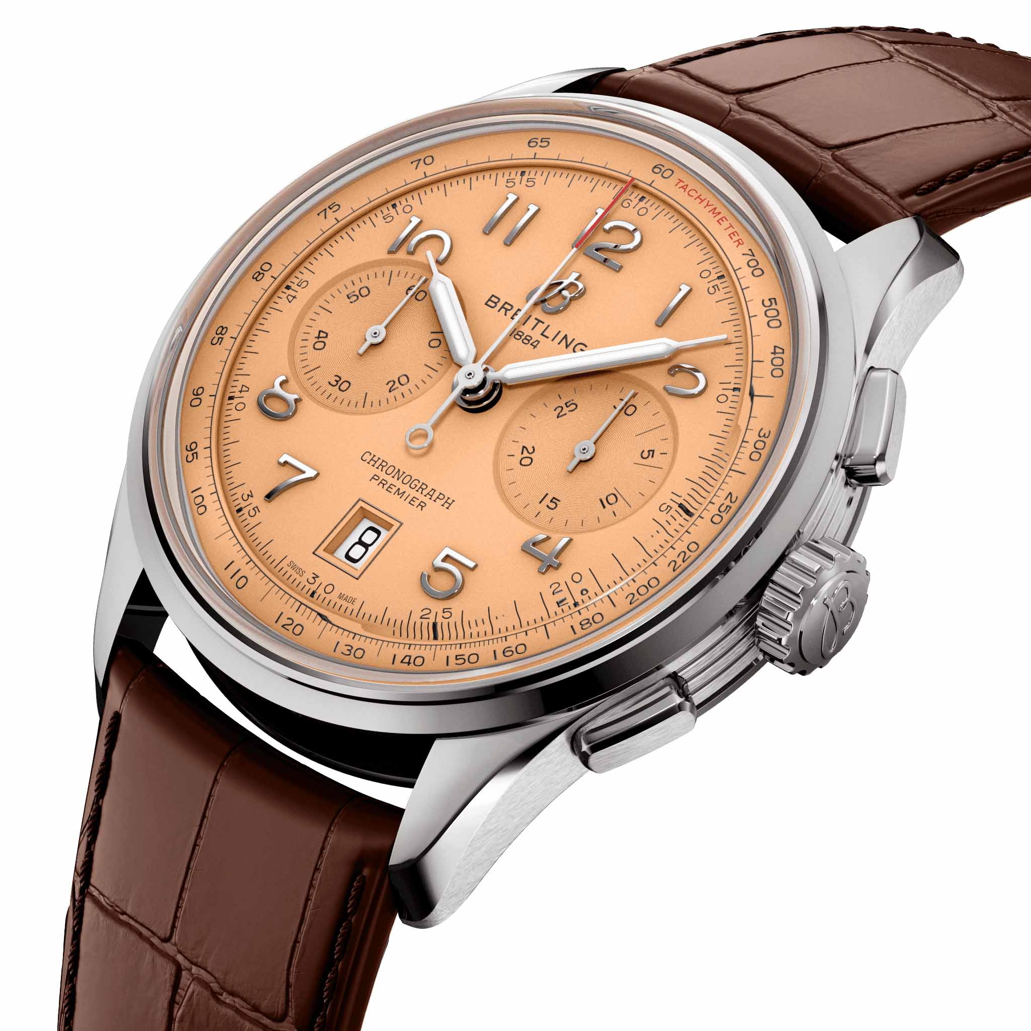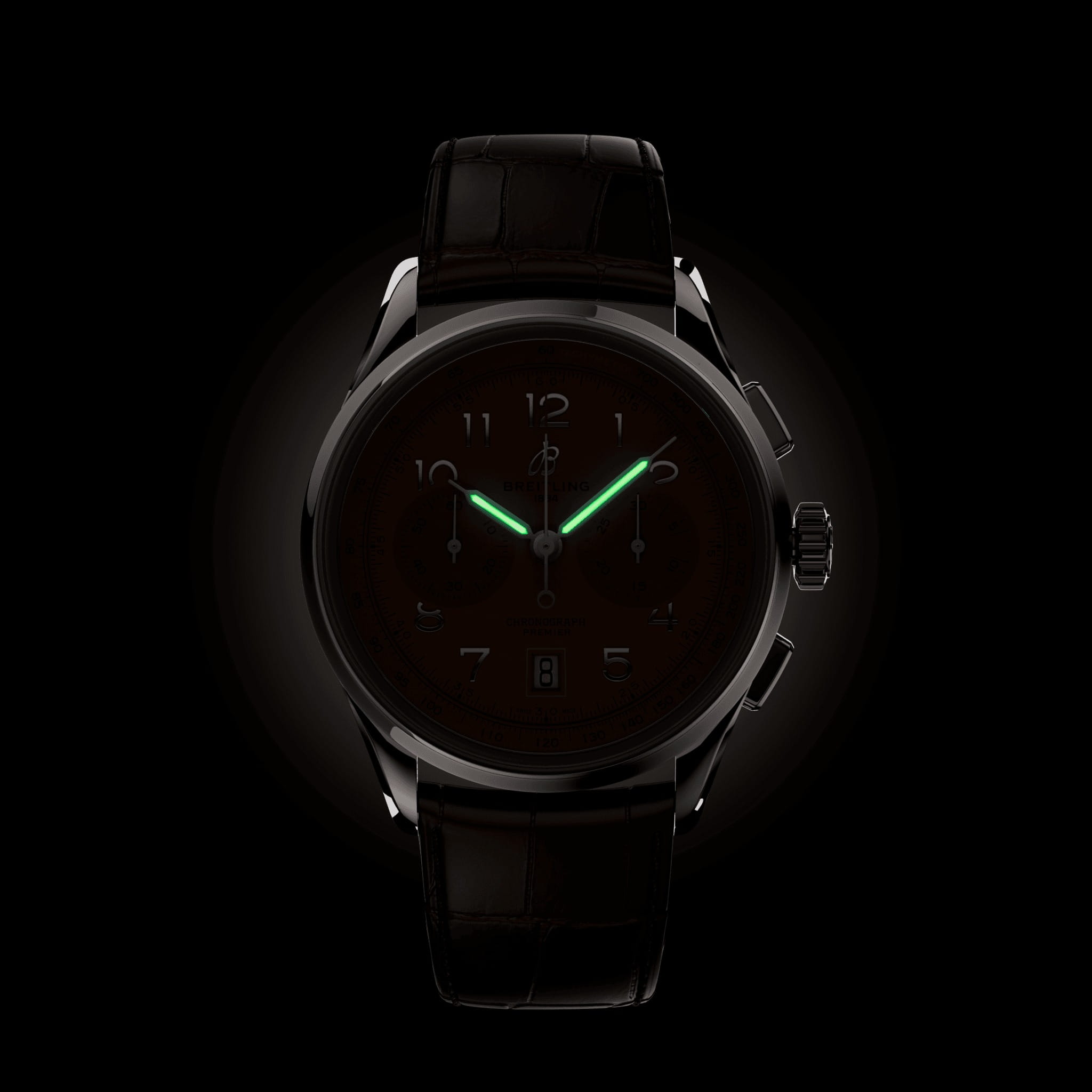 Мужские швейцарские часы-хронографХронографФункция позволяет измерять отрезки времени с особой точностью: часы, минуты, секунды. Верным признаком хронографа является наличие на циферблате 3 дополнительных окошек-счётчиков. с тахиметромТахиметрРазмеченная шкала, располагается на ободке или безеле часов. Тахиметр позволяет рассчитать скорость на определённом участке пути, расстояние измеряется в километрах или милях. Breitling Premier B01 Chronograph 42 AB0145331K1P2, механический механизм (автоматический калибр) с высокой точностью. Сапфировое стеклоСапфировое стеклоПрочный и надёжный материал из кристалла сапфира синтетического происхождения, характеризующийся особой твёрдостью и устойчивостью к царапинам и повреждениям. с антибликовым покрытием устойчивое к появлению царапин, обладающее высокой прозрачностью. Класс водозащиты: 100 метров, позволит плавать, нырять и заниматься другими водными видами спорта. Корпус часов изготовлен из стали. Кожаный крокодиловый ремешок с раскладной застёжкойРаскладная застёжкаТакой тип застёжки используется только на браслетах из металла. Она никогда не раскрывается полностью, происходит разделение на 2 и более частей. Раскладывающая застёжка снизит вероятность потери часов к минимуму.. Стрелки с люминесцентным покрытиемЛюминесцентное покрытиеПозволяет считывать показания времени в темноте. Производители наносят на стрелки, часовые индексы, безель или поверхность циферблата светонакопительный состав, дающий холодное свечение.. Окошко даты находится в положении 6 часов.