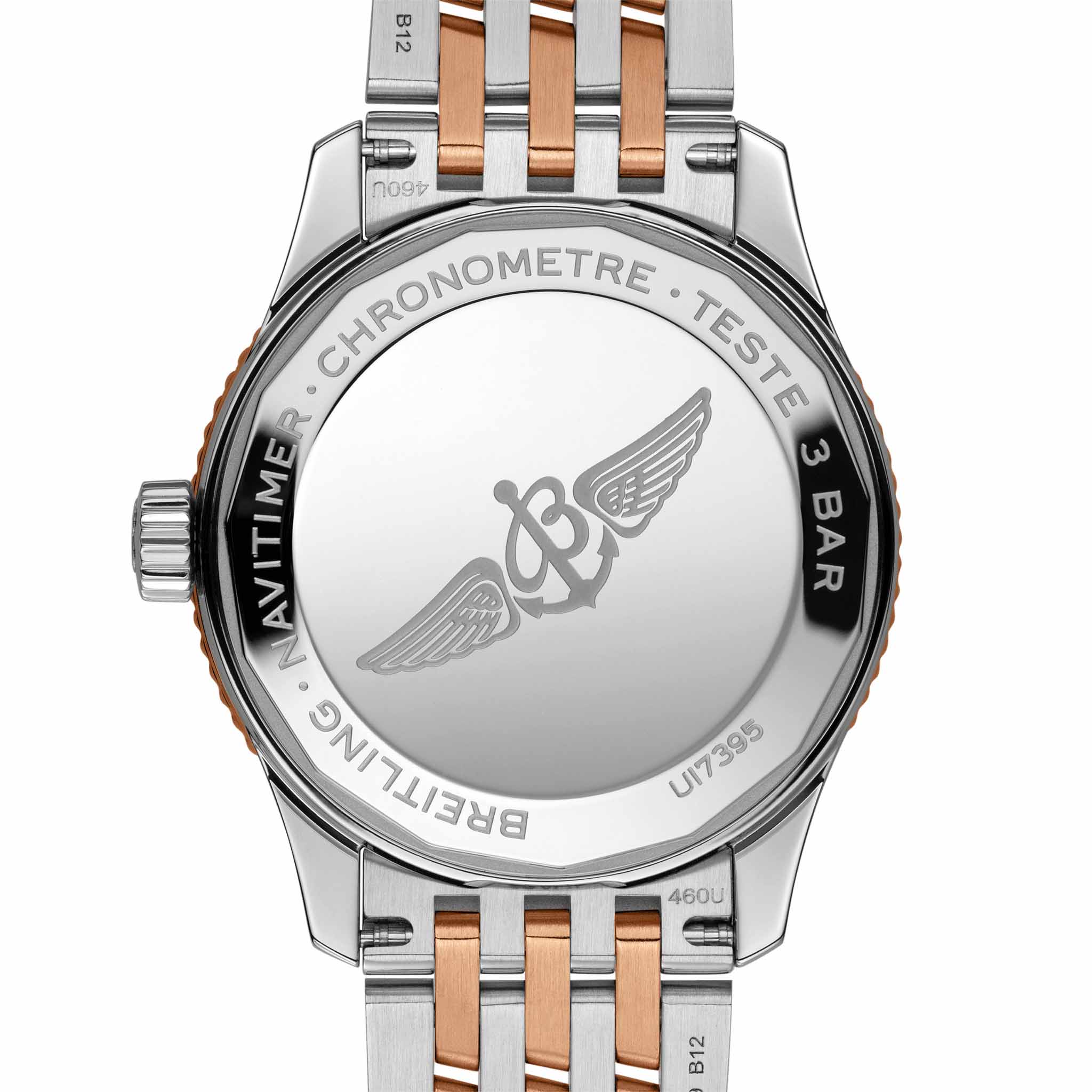 Женские швейцарские часы-хронометр Breitling Navitimer Automatic 35 U17395211A1U1, механический механизм (автоматический калибр) с высокой точностью. Сапфировое стеклоСапфировое стеклоПрочный и надёжный материал из кристалла сапфира синтетического происхождения, характеризующийся особой твёрдостью и устойчивостью к царапинам и повреждениям. устойчивое к появлению царапин, обладающее высокой прозрачностью. Класс водозащиты: 30 метров, позволит защитить корпус от случайных брызг или капель дождя. Корпус часов изготовлен из стали. Стальной браслет с раскладной застёжкойРаскладная застёжкаТакой тип застёжки используется только на браслетах из металла. Она никогда не раскрывается полностью, происходит разделение на 2 и более частей. Раскладывающая застёжка снизит вероятность потери часов к минимуму. с красным 18-каратным золотом18-каратное золотоОбозначение по каратной системе пробирования, оно показывает, сколько драгоценного металла содержится в изделии. 18 карат - в составе 75% чистого золота, соответствует 750 пробе.