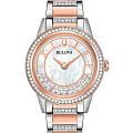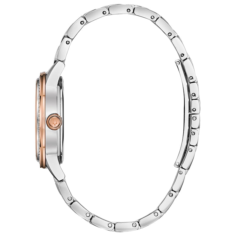Женские кварцевые часы Bulova Crystal Ladies 98L246 – отражающий идеальное сочетание современного дизайна, надёжности и функциональности. Элегантный облик станет превосходным завершением образа, наделив его индивидуальным характером. Корпус из нержавеющей стали, диаметром 33 мм идеально сбалансирован и элегантен. Минеральное стеклоМинеральное стеклоМинеральное стекло представляет собой искусственно выращенный минерал кварца. Такое стекло отличается особой устойчивостью к повреждениям и царапинам. Уступает по некоторым качествам сапфировому стеклу. защищает циферблат от царапин и устойчивое к мелким механическим повреждениям. БезельБезельВнешний ободок, закрепляющий стекло. В спортивных часах так называется поворотное кольцо с делениями на циферблате, выполняет роль таймера – замеряет отрезки времени на шкале. Неподвижный безель – элемент декора. Однонаправленно вращающийся безель на дайверских часах позволяет фиксировать моменты погружения и выныривания на поверхность. с IP-покрытиемIP-покрытиеМетод ионного напыления. Демонстрирует повышенную устойчивость к истиранию, окислению и химическим веществам. Под воздействием высокого давления и температуры около 1500°C молекулы металла надёжно соединяются с частицами корпуса часов., браслет и циферблат украшены кристаллами Swarovski. Стальной браслет с IP-покрытиемIP-покрытиеМетод ионного напыления. Демонстрирует повышенную устойчивость к истиранию, окислению и химическим веществам. Под воздействием высокого давления и температуры около 1500°C молекулы металла надёжно соединяются с частицами корпуса часов. а застёжке-бабочке с кнопкамиЗастёжка "бабочка"Такой вид застёжки дополняется предохранителями, помогающими избежать случайного раскрытия браслета. Обладают изящным исполнением.  обеспечивает комфортное ношение. Водозащита 30 метров позволит защитить корпус от случайных брызг или капель дождя. Эта модель – отличный выбор для тех, кто ищет сочетание стиля, качества и функциональности. Часы станут не только полезным аксессуаром, но и выразительным элементом вашего имиджа.