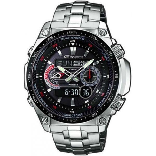 Светодиодная подсветка с автоподсветкой обеспечивает освещение всего циферблата, функция автоподсветки обеспечивает автоматическое включение подсветки. Питание от солнечной энергии, индикатор заряда батареи. Секундомер с точностью показаний 1/100с и временем измерения 24ч. Сплит-хронограф. Таймер обратного отсчета от 1мин до 60мин с автоповтором. Коррекция текущего времени радиосигналом на территории почти всей Европы, Китая, США и Японии. 12-ти и 24-х часовой формат времени. Мировое время. Водонепроницаемость 100м. Минеральное стекло устойчиво к царапинам. Корпус и браслет из нержавеющей стали.