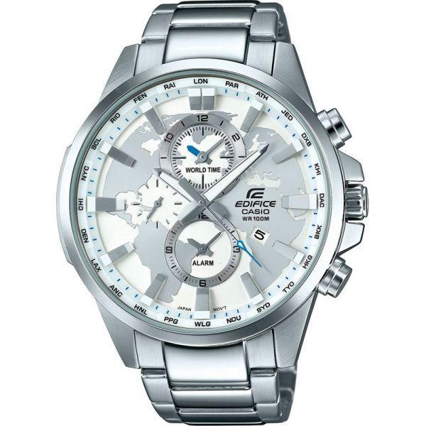 Часы CASIO EFR-303D-7A - мужские элегантные наручные часы из серии Casio Edifice. Круглый корпус, выполненный из стали, защищен минеральным стеклом, устойчивым к царапинам. Часы удерживаются на руке браслетом из высокопрочной стали с антикоррозийными свойствами. Многофункциональный кварцевый механизм, отображение второго часового пояса. Выступы на корпусе защищают переводную коронку.  Люминисцентная подсветка стрелок и часовых меток.