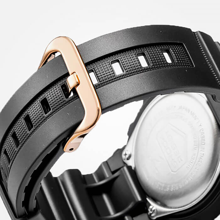 Компактный аксессуар имеет противоударный корпусУдаропрочный корпусМеханизм заключён в корпус, выполненный из современных материалов, устойчивых к ударам, механическим повреждениям и падению с высоты: инновационный пластик, карбон, нержавеющая сталь, титан. из полимерного материала, способного выдерживать падения с высоты и повреждения. Привлекательно смотрится безельБезельВнешний ободок, закрепляющий стекло. В спортивных часах так называется поворотное кольцо с делениями на циферблате, выполняет роль таймера – замеряет отрезки времени на шкале. Неподвижный безель – элемент декора. Однонаправленно вращающийся безель на дайверских часах позволяет фиксировать моменты погружения и выныривания на поверхность. из нержавеющей стали 316L с IP-покрытиемIP-покрытиеМетод ионного напыления. Демонстрирует повышенную устойчивость к истиранию, окислению и химическим веществам. Под воздействием высокого давления и температуры около 1500°C молекулы металла надёжно соединяются с частицами корпуса часов., а также детали в цвете розового золота. Аналого-цифровые часы работают от батарейки, рассчитанной на 3 года безупречной эксплуатации. Минеральное стекло. Автоматическая светодиодная подсветкаСветодиодная подсветкаСветодиодная или LED-подсветка обеспечивает появление яркого холодного свечения за счёт LED-элементов - маленьких лампочек. Они потребляют минимальное количество энергии, чаще всего можно встретить 1 светодиод, в нижней части циферблата. дисплея, стрелки и метки с люминесцентным покрытиемЛюминесцентное покрытиеПозволяет считывать показания времени в темноте. Производители наносят на стрелки, часовые индексы, безель или поверхность циферблата светонакопительный состав, дающий холодное свечение.. 12/24-часовое отображение времени. Надёжный полимерный ремешок. Водонепроницаемость 200 метров. Дополнительные возможности: таймер, будильник, мировое времяМировое время Полезное часовое усложнение, отображающее время в основных городах и известных областях по всему миру, оно связано с часовыми поясами, удобно для путешественников и бизнесменов. , секундомер, автоматический календарь. Габариты: 46,4 x 52 x 14,9 мм.