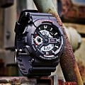 Японские мужские часы-хронографХронографФункция позволяет измерять отрезки времени с особой точностью: часы, минуты, секунды. Верным признаком хронографа является наличие на циферблате 3 дополнительных окошек-счётчиков. Casio G-Shock GA-110-1A из коллекции G-Shock. Противоударный пластиковый корпус с карбоновыми волокнами более прочный и, в то же время, более легкий. Минеральное стеклоМинеральное стеклоМинеральное стекло представляет собой искусственно выращенный минерал кварца. Такое стекло отличается особой устойчивостью к повреждениям и царапинам. Уступает по некоторым качествам сапфировому стеклу. устойчивое к появлению царапин, обладающее высокой прозрачностью. Ударопрочный корпусУдаропрочный корпусМеханизм заключён в корпус, выполненный из современных материалов, устойчивых к ударам, механическим повреждениям и падению с высоты: инновационный пластик, карбон, нержавеющая сталь, титан. защищает механизм от ударов и вибрации. Многокомпонентный циферблат состоит из цифровых окошек указателей числа и дня недели, а также индикатора режима работы часов, который расположен в позиции 9 часов и выполнен в виде пропеллера. Подсветка Neon IlluminatorNeon IlluminatorУникальная подсветка циферблата. На индексы наносятся специальные флуоресцентные чернила, которые подсвечиваются светодиодной подсветкой. освещает весь циферблат. Мировое времяМировое время Полезное часовое усложнение, отображающее время в основных городах и известных областях по всему миру, оно связано с часовыми поясами, удобно для путешественников и бизнесменов. – 48 городов (29 часовых поясов). СекундомерСекундомерСекундоме́р — прибор, способный измерять интервалы времени с точностью до долей секунды. с точностью измерения 1/100 секунды и измерением до 23 часов 59 минут 59,99 cек. ТаймерТаймерОтсчитывает секунды в обратном направлении в заданном интервале времени. обратного отсчета (диапазон времени 24 часа), автоматический календарь, 12/24 отображение времени. 5 будильниковБудильникБуди́льник — часы, в заданный момент времени подающие звуковой, световой и/или в редких случаях другой сигнал., ежечасный сигнал. Класс водозащиты: 200 метров, позволит плавать, нырять и заниматься другими водными видами спорта. Ремешок из полимерного материала на стандартной застежке.