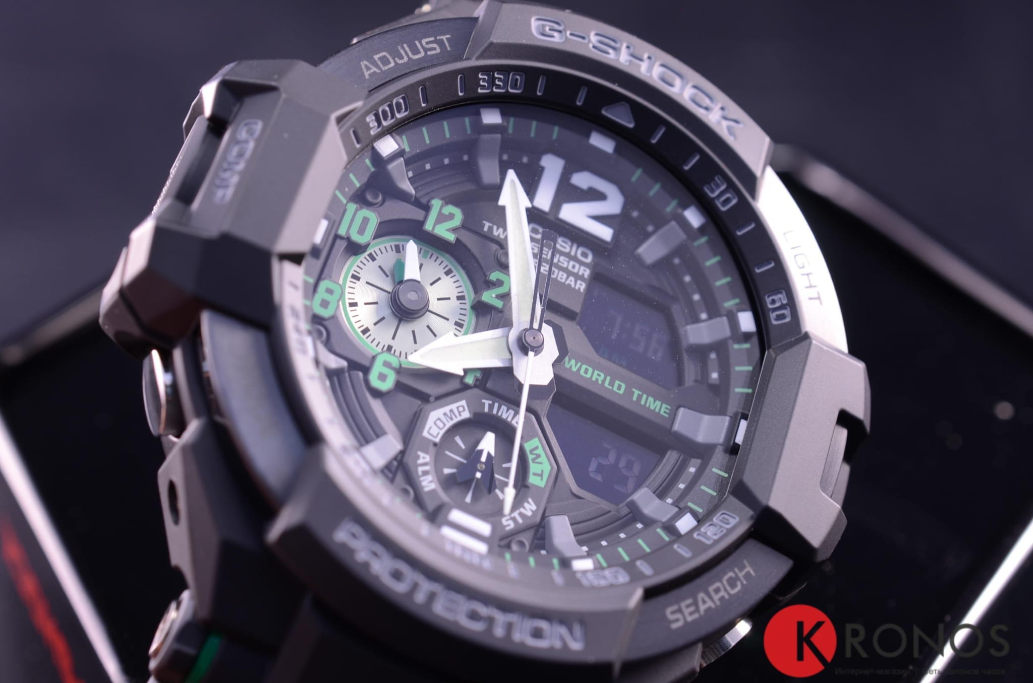 Ударопрочная конструкция защищает от ударов и вибрации. Светящееся покрытие обеспечивает длительную подсветку в темное время суток после короткого воздействия света. Встроенный цифровой компас определяет северный магнитный полюс. Датчик измеряет температуру окружающего воздуха вокруг часов и отображает ее на экране в градусах  °C (-10°C /+60°C). Отображение текущего времени в основных городах и конкретных областях по всему миру. Функция секундомера - 1/100 сек. - 1 час. Для поклонников точности: таймеры обратного отсчета напомнят Вам о текущих или особенных событиях, издав звуковой сигнал в установленное время.  Время можно предварительно настроить от 1 минуты и до 1 часа. Нажатие на кнопку обеспечит перемещение стрелок в такое положение, которое позволит Вам легко считать информацию с маленьких цифровых дисплеев – например, дату или показатели секундомера. Можно отключить звук при нажатии кнопок.  Автоматический календарь. Прочное, устойчивое к царапинам минеральное стекло защищает часы от повреждений. Корпус из нержавеющей стали и полимерного пластика. Ремешок из полимерного материала. Водонепроницаемость (20 Бар). Идеально подходит для ныряния без акваланга.