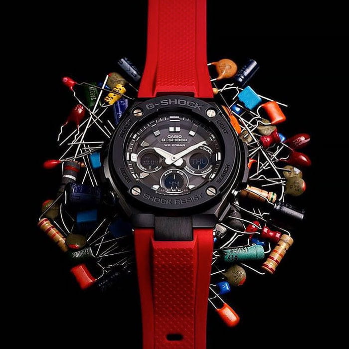 Брендовая модель серии G-Steel представлена в оригинальном исполнении, дизайнеры акцентировали внимание на внушительном безелеБезельВнешний ободок, закрепляющий стекло. В спортивных часах так называется поворотное кольцо с делениями на циферблате, выполняет роль таймера – замеряет отрезки времени на шкале. Неподвижный безель – элемент декора. Однонаправленно вращающийся безель на дайверских часах позволяет фиксировать моменты погружения и выныривания на поверхность. с IP-покрытиемIP-покрытиеМетод ионного напыления. Демонстрирует повышенную устойчивость к истиранию, окислению и химическим веществам. Под воздействием высокого давления и температуры около 1500°C молекулы металла надёжно соединяются с частицами корпуса часов.. Стильным дополнением стал красный каучуковый ремешок, обеспечивающий комфортное ношение. Это часы на солнечной батарее , позволяющие забыть о необходимости завода. Люминесцентная подсветкаЛюминесцентное покрытиеПозволяет считывать показания времени в темноте. Производители наносят на стрелки, часовые индексы, безель или поверхность циферблата светонакопительный состав, дающий холодное свечение. стрелок, яркая светодиодная подсветкаСветодиодная подсветкаСветодиодная или LED-подсветка обеспечивает появление яркого холодного свечения за счёт LED-элементов - маленьких лампочек. Они потребляют минимальное количество энергии, чаще всего можно встретить 1 светодиод, в нижней части циферблата. дисплея. Ударопрочный корпусУдаропрочный корпусМеханизм заключён в корпус, выполненный из современных материалов, устойчивых к ударам, механическим повреждениям и падению с высоты: инновационный пластик, карбон, нержавеющая сталь, титан. из пластика и хирургической стали 316L. Водостойкость 20 бар. Таймер, секундомер, будильник, мировое времяМировое время Полезное часовое усложнение, отображающее время в основных городах и известных областях по всему миру, оно связано с часовыми поясами, удобно для путешественников и бизнесменов. , автоматический календарь, приём радиосигнала для корректировки времени, хронографХронографФункция позволяет измерять отрезки времени с особой точностью: часы, минуты, секунды. Верным признаком хронографа является наличие на циферблате 3 дополнительных окошек-счётчиков.. Габариты: 55,9 x 49,3 x 15,3 мм.