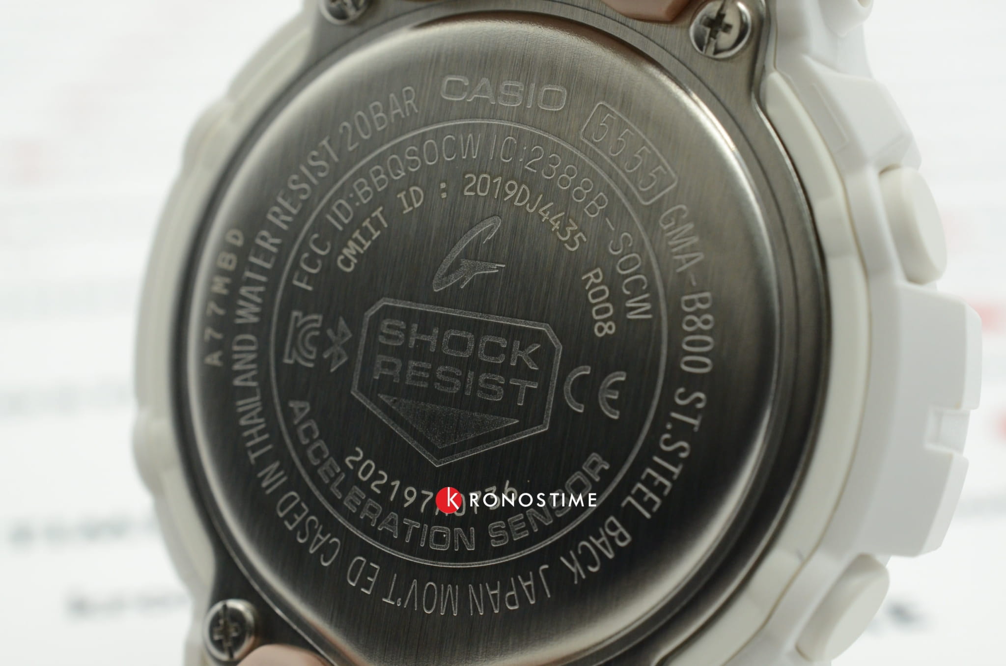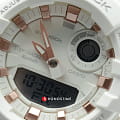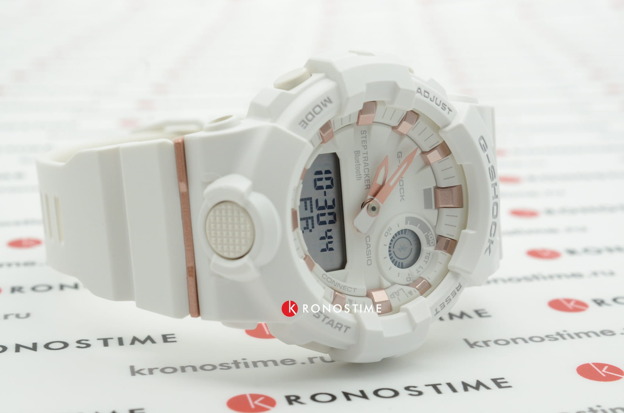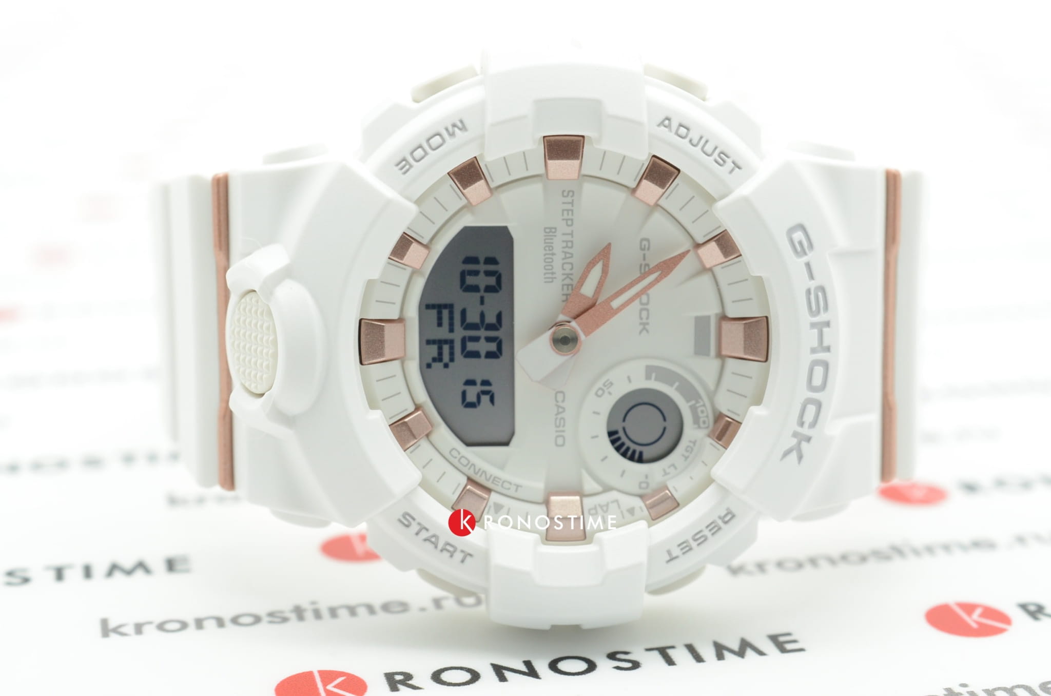 Аксессуар в белоснежном исполнении с цветовыми акцентами цвета розового золота стильно смотрится на запястье и подойдёт к любой одежде. Модель оснащена дополнительными усложнениями, помогающими повысить эффективность тренировок: трекер активности измеряет количество шагов от 0 до 999999, секундомер с памятью на 200 результатов, мультифункциональный таймер. Данные можно хранить и анализировать в специальном приложении для смартфонов G-Shock Connected App, чему способствует технология Bluetooth 4.0BluetoothСовременная технология, позволяющая синхронизировать часы с телефоном и переносить данные. Часы с Bluetooth расширяют возможности вашего смартфона и делают его использование ещё более удобным.. Японский кварцевый механизм работает от батарейки, срок её службы составляет 2 года. Минеральное стекло противостоит появлению царапин. Светодиодная подсветкаСветодиодная подсветкаСветодиодная или LED-подсветка обеспечивает появление яркого холодного свечения за счёт LED-элементов - маленьких лампочек. Они потребляют минимальное количество энергии, чаще всего можно встретить 1 светодиод, в нижней части циферблата.. Водонепроницаемость 200 метров. Противоударный корпусУдаропрочный корпусМеханизм заключён в корпус, выполненный из современных материалов, устойчивых к ударам, механическим повреждениям и падению с высоты: инновационный пластик, карбон, нержавеющая сталь, титан. и гибкий ремешок из полимерного материала. ХронографХронографФункция позволяет измерять отрезки времени с особой точностью: часы, минуты, секунды. Верным признаком хронографа является наличие на циферблате 3 дополнительных окошек-счётчиков., будильник, мировое времяМировое время Полезное часовое усложнение, отображающее время в основных городах и известных областях по всему миру, оно связано с часовыми поясами, удобно для путешественников и бизнесменов. , автоматический календарь до 2099 года. Габариты: 50,7 x 45,2 x 15,5 мм.