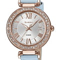 Изысканный аксессуар привлекает невероятным исполнением, минималистичный циферблат с римскими цифрами и утончёнными стрелками дополнен лаконичным узором. Изогнутый безельБезельВнешний ободок, закрепляющий стекло. В спортивных часах так называется поворотное кольцо с делениями на циферблате, выполняет роль таймера – замеряет отрезки времени на шкале. Неподвижный безель – элемент декора. Однонаправленно вращающийся безель на дайверских часах позволяет фиксировать моменты погружения и выныривания на поверхность. щедро усыпан стразами Swarovski, несколько кристаллов можно увидеть и на циферблате. Кварцевый высокоточный механизм. Голубой ремешок из натуральной кожи. Корпус из нержавеющей стали с IP-покрытиемIP-покрытиеМетод ионного напыления. Демонстрирует повышенную устойчивость к истиранию, окислению и химическим веществам. Под воздействием высокого давления и температуры около 1500°C молекулы металла надёжно соединяются с частицами корпуса часов.. Минеральное стекло. Водонепроницаемость при давлении 5 бар. Прямоугольная апертура даты. Габариты: 36 x 41 x 8 мм.