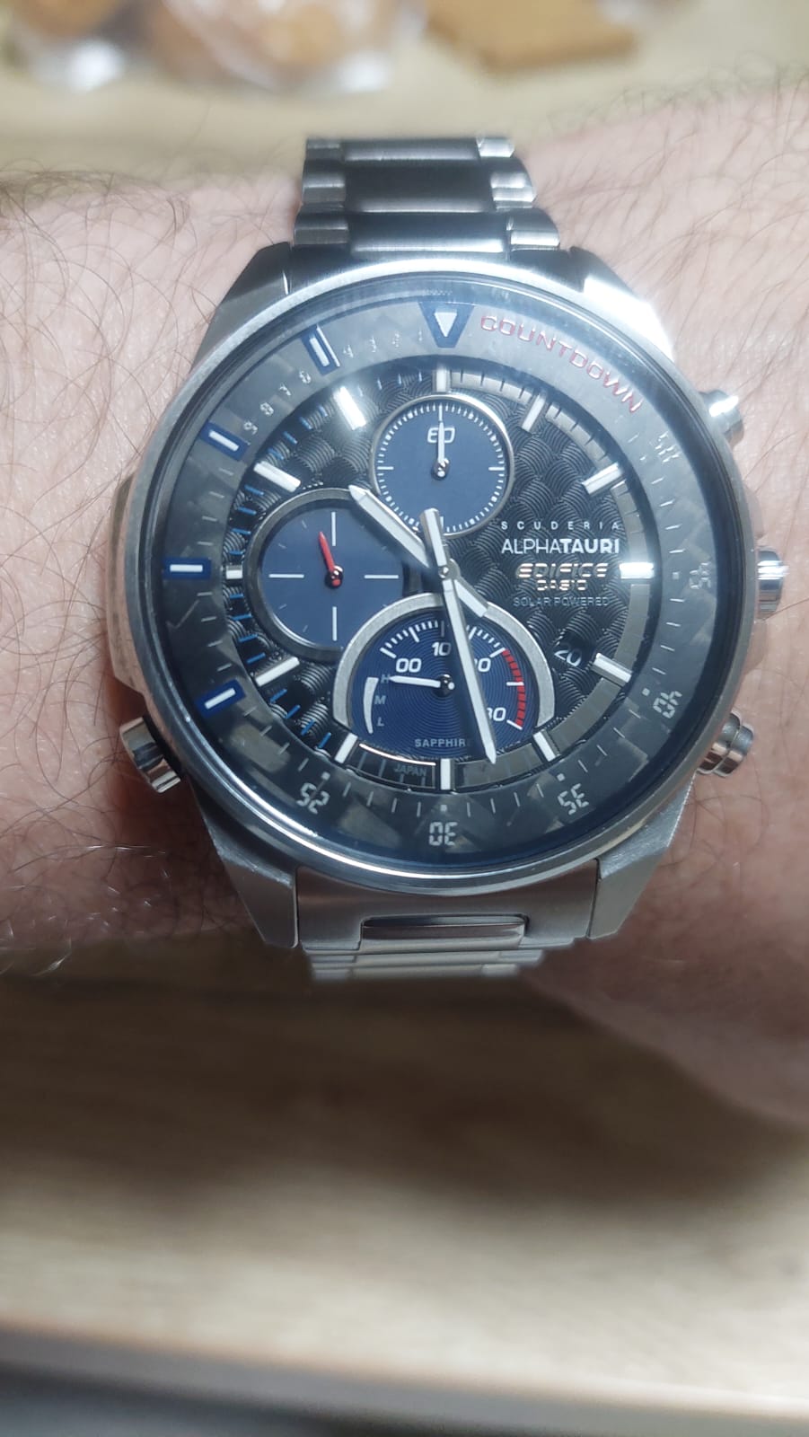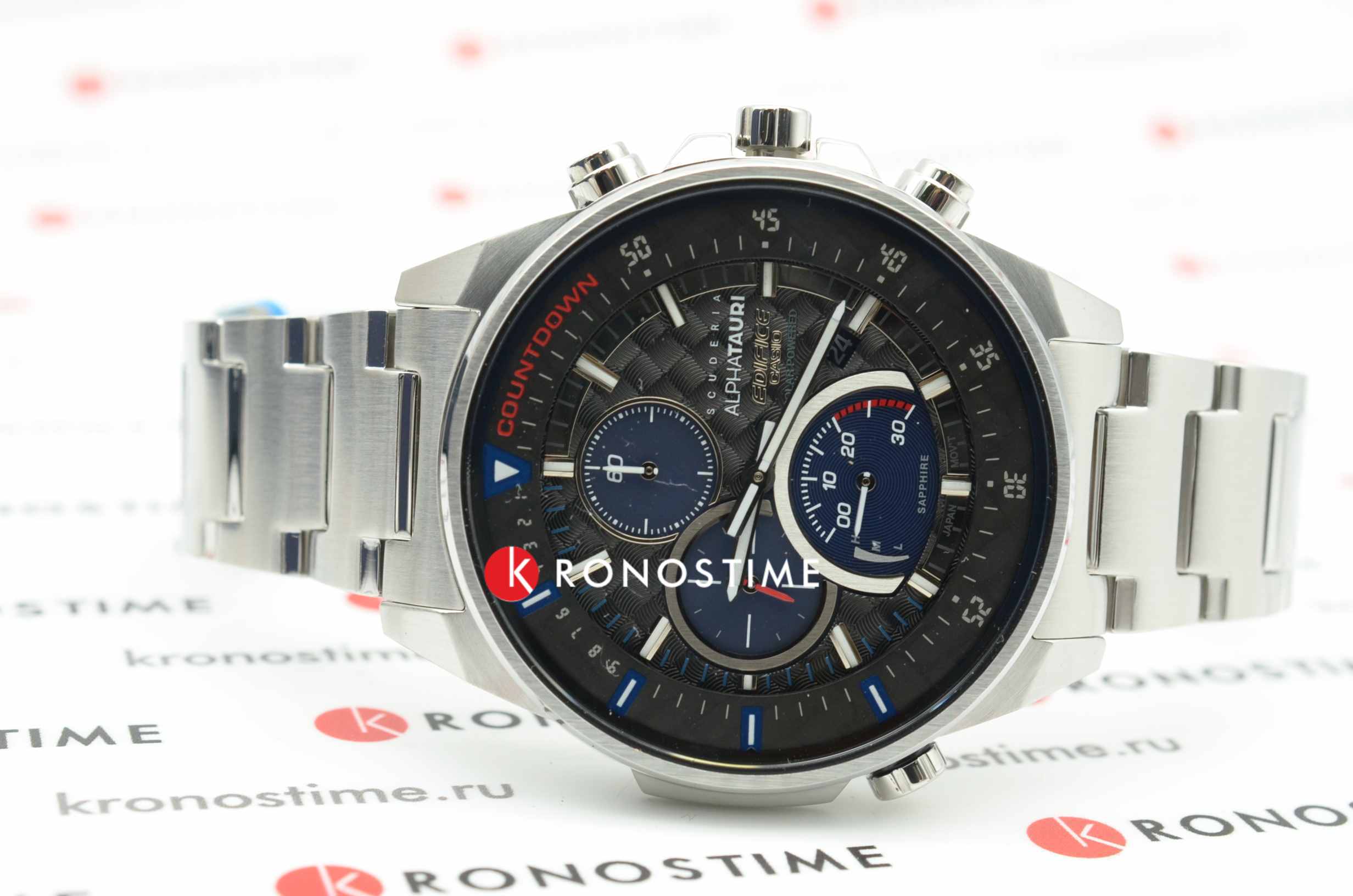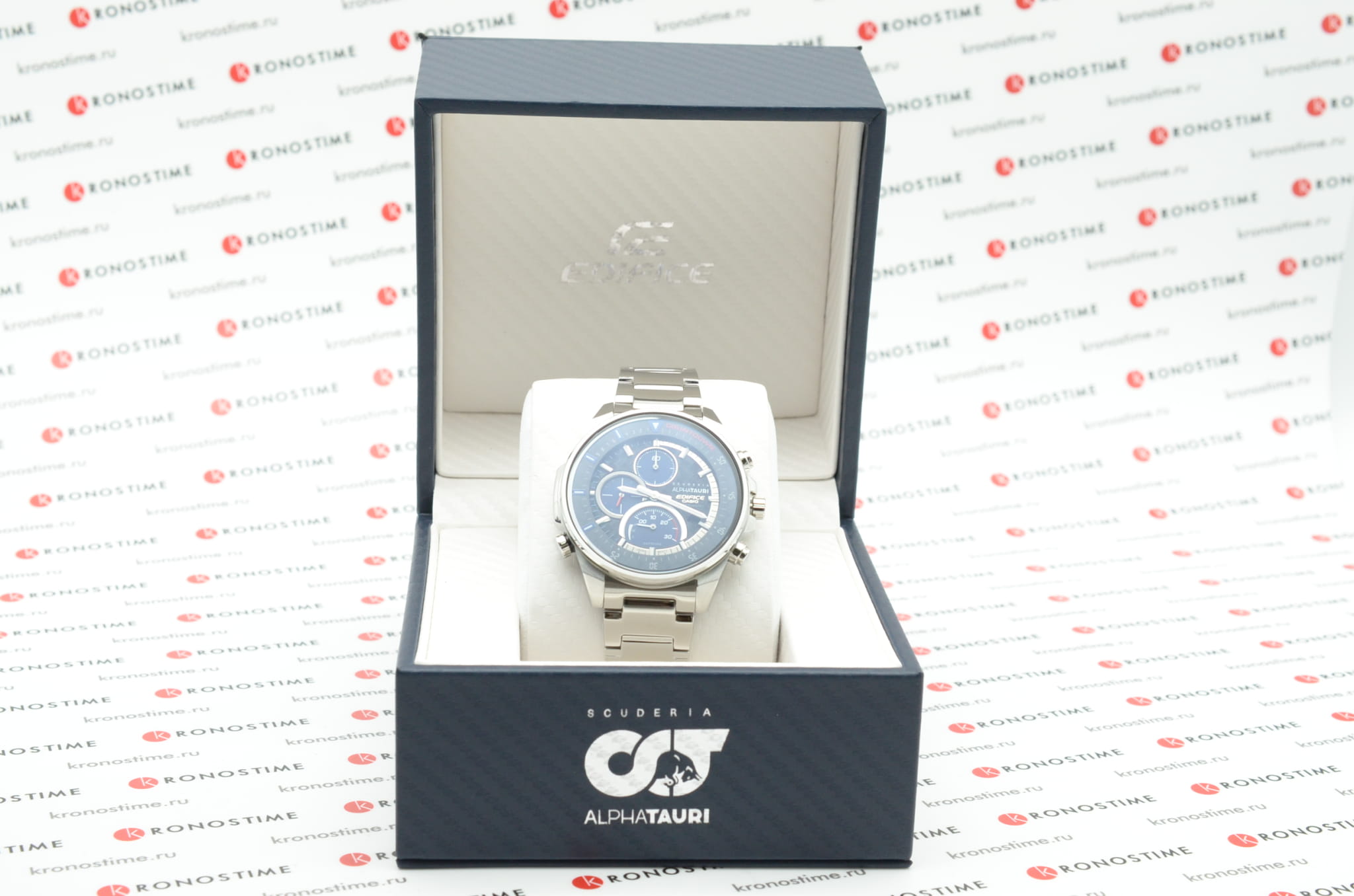Коллаборация Edifice и итальянской гоночной команды Формулы-1 Scuderia AlphaTauri из серии EFS-S590 в стальном корпусе на стальном браслете. Лимитированная серия. Casio Edifice EFS-S590AT-1A из коллекции Edifice раскрывают автомобильную тематику.