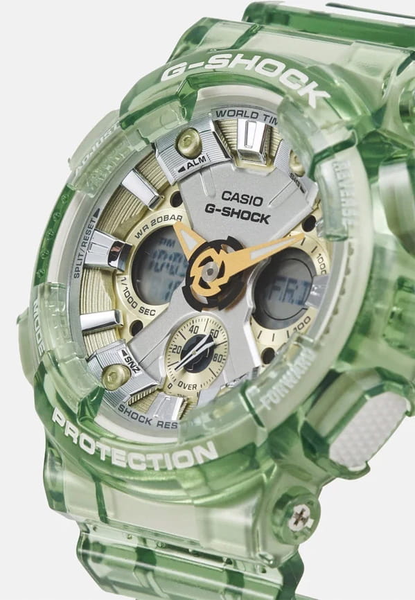 Японские ударопрочныеУдаропрочный корпусМеханизм заключён в корпус, выполненный из современных материалов, устойчивых к ударам, механическим повреждениям и падению с высоты: инновационный пластик, карбон, нержавеющая сталь, титан. женские часы с хронографом Casio G-Shock GMA-S110GS-3A, кварцевый механизм с высокой точностью. Класс водозащиты: 200 метров, позволит плавать, нырять и заниматься другими водными видами спорта. Корпус часов изготовлен из пластика. Прозрачный ремешок и корпус в сочетании с двухцветными элементами циферблата создают сбалансированный, плавный, современный стиль. Циферблат с светодиодной подсветкойСветодиодная подсветкаСветодиодная или LED-подсветка обеспечивает появление яркого холодного свечения за счёт LED-элементов - маленьких лампочек. Они потребляют минимальное количество энергии, чаще всего можно встретить 1 светодиод, в нижней части циферблата., функция автоподсветки освещает циферблат при повороте часов к лицу, функция Afterglow (для подсветки не нужно удерживать кнопку, выбор времени послесвечения). Цвет подсветки: оранжевый. Ударопрочный корпусУдаропрочный корпусМеханизм заключён в корпус, выполненный из современных материалов, устойчивых к ударам, механическим повреждениям и падению с высоты: инновационный пластик, карбон, нержавеющая сталь, титан. защищает механизм от ударов и вибрации. Защищены от магнитных полей. СекундомерСекундомерСекундоме́р — прибор, способный измерять интервалы времени с точностью до долей секунды. с точностью показаний 1/1000с и временем измерения 100ч. Сплит-хронографСплит-хронографИспользуется для измерения продолжительности нескольких временных отрезков, начинающихся одновременно, а заканчивающихся в разное время.. ТаймерТаймерОтсчитывает секунды в обратном направлении в заданном интервале времени. обратного отсчета от 1мин до 24ч с автоповтором. Мировое времяМировое время Полезное часовое усложнение, отображающее время в основных городах и известных областях по всему миру, оно связано с часовыми поясами, удобно для путешественников и бизнесменов. : 29 часовых поясов (48 городов + координированное универсальное время), включение/выключение перехода на летнее время, переключение городов домашнего/мирового времени. 12-ти и 24-х часовой формат времени.