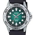 Мужские кварцевые часы Casio MTD-140-3A — надёжный спортивный аксессуар с японской точностью. Круглый корпус размером 43,7 мм из нержавеющей стали, зелёный циферблат с точками и штрихами, окошко даты в положении 3 часов. Стекло — минеральноеМинеральное стеклоМинеральное стекло представляет собой искусственно выращенный минерал кварца. Такое стекло отличается особой устойчивостью к повреждениям и царапинам. Уступает по некоторым качествам сапфировому стеклу.. Стрелки и метки с люминесцентным покрытиемЛюминесцентное покрытиеПозволяет считывать показания времени в темноте. Производители наносят на стрелки, часовые индексы, безель или поверхность циферблата светонакопительный состав, дающий холодное свечение.. Механизм — кварцевый, точность ±20 секунд в месяц, срок службы батареи — до 3 лет. Водонепроницаемость 100 м. Ремешок — из прочного полимерного материала на стандартной застёжке. Идеальный выбор для тех, кто ценит японское качество и функциональный повседневный стиль.