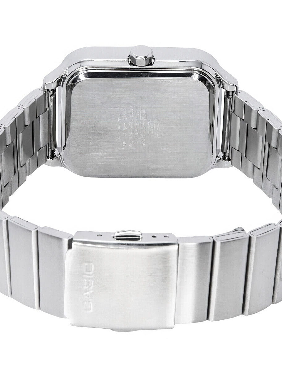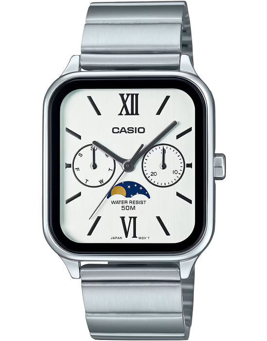 Японские мужские кварцевые часы с минеральным стекломМинеральное стеклоМинеральное стекло представляет собой искусственно выращенный минерал кварца. Такое стекло отличается особой устойчивостью к повреждениям и царапинам. Уступает по некоторым качествам сапфировому стеклу. Casio Collection MTP-M305D-7A2VDF (MTP-M305D-7A2), кварцевый механизм с высокой точностью. Корпус часов изготовлен из нержавеющей стали. Циферблат с метками в виде штрихов. Особенностью модели является наличие индикатора фазы луны над шестью часами по циферблату. Индикатор имеет 4 положения и отображается новолуние и полнолуние, а также растущую и убывающую Луну. Батарейка рассчитана на 3 года. Класс водозащиты: 50 метров, позволит защитить корпус от случайных брызг или капель дождя. Стальной браслет на раскладной застёжкеРаскладная застёжкаТакой тип застёжки используется только на браслетах из металла. Она никогда не раскрывается полностью, происходит разделение на 2 и более частей. Раскладывающая застёжка снизит вероятность потери часов к минимуму..