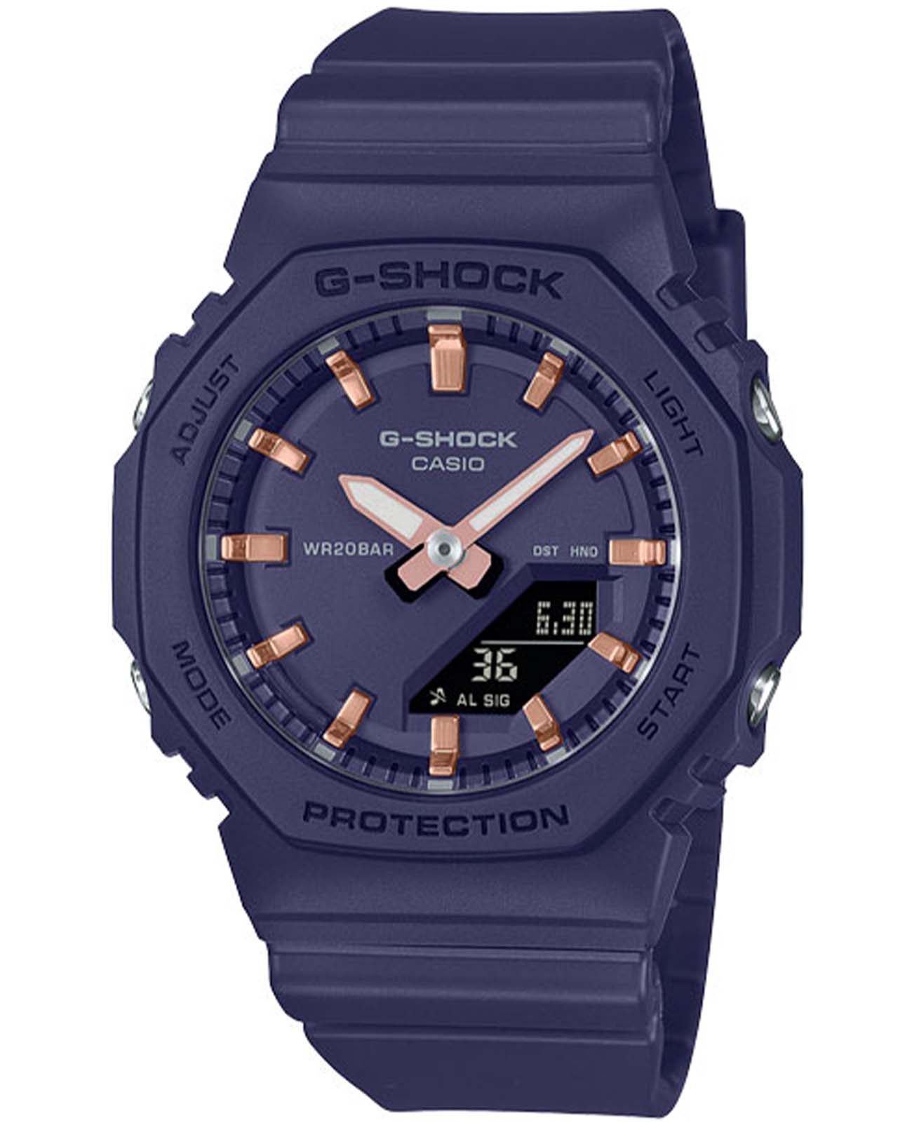 Женские кварцевые часы Casio G-Shock GMA-P2100M-2A. Корпус часов изготовлен из пластика. Стрелки с люминесцентным покрытиемЛюминесцентное покрытиеПозволяет считывать показания времени в темноте. Производители наносят на стрелки, часовые индексы, безель или поверхность циферблата светонакопительный состав, дающий холодное свечение.. Водозащита: 200 метров, позволит плавать, нырять и заниматься другими водными видами спорта. Минеральное стеклоМинеральное стеклоМинеральное стекло представляет собой искусственно выращенный минерал кварца. Такое стекло отличается особой устойчивостью к повреждениям и царапинам. Уступает по некоторым качествам сапфировому стеклу. устойчивое к появлению царапин, обладающее высокой прозрачностью. Необритовое светонакопительное покрытие обеспечивает длительное послесвечение в темноте даже после кратковременного нахождения на свету. 12-ти и 24-х часовой формат времени. Секундомер с двумя точностями показаний: 1/100с (до 1ч) и 1с (после 1ч) и временем измерения 24ч. SPLIT-хронограф. Таймер обратного отсчета от 1с до 24ч. Мировое время – 48 городов (31 часовой пояс), всемирное координированное время (UTC). Пластиковый ремешок с классической застежкой.