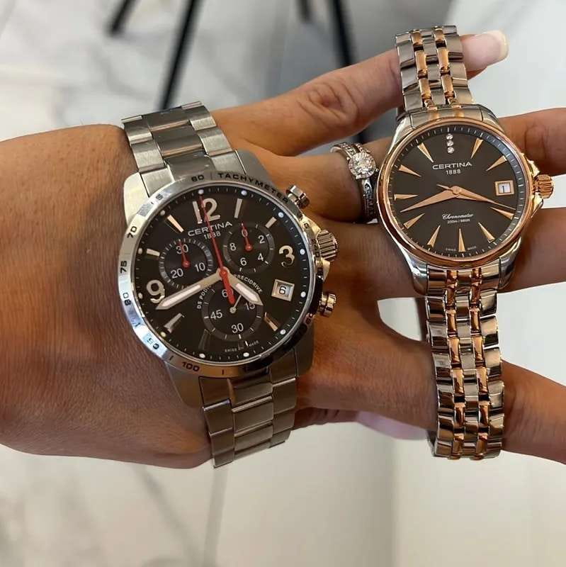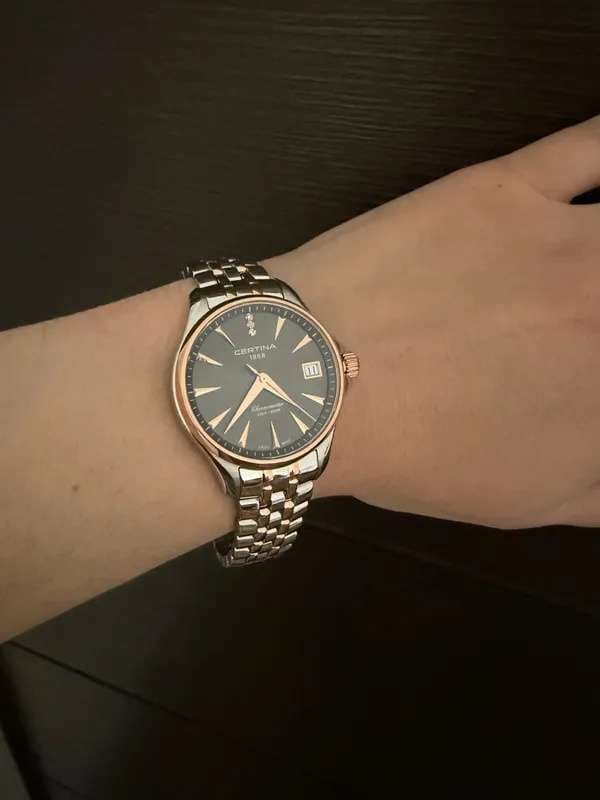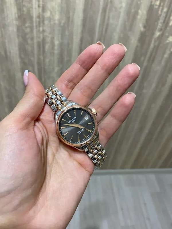Аксессуар обладает изящным силуэтом, отражающим классический стиль и элегантность. Циферблат украшен 3 роскошными бриллиантами оттенка Top Wesselton. Часы комплектуются высокоточным кварцевым калибром F06.411 от швейцарской компании ETA, высокая точность механизма подтверждается сертификатом хронометра COSCСертификат COSCОфициальный сертификат, подтверждающий то, что часы ходят с особо высокой точностью. Для получения документа часы подвергаются тестовым испытаниям, разработанным швейцарским институтом тестирования хронометров COSC. Допустимая норма для механических часов -4/+6 секунд в день, для кварцевых моделей +/- 0,07 секунд в день.. Концепция DS ConceptDS ConceptDouble Security Concept, обозначает двойную надёжность и безупречную точность часов Certina. Двойная система защиты подразумевает обеспечение максимальной устойчивости к ударам и высоких показателей водонепроницаемости. гарантирует повышенную ударопрочность часов и сохранение водонепроницаемости до 20 бар. Одностороннее антибликовое покрытие сапфирового стекла.Корпус и браслет из хирургической стали 316L. PVD-покрытиеPVDУльтратонкое покрытие наносится в технике вакуумного напыления, сочетает в себе нитрид титана особой прочности со слоем золота или оксида хрома. Несёт в себе декоративную или защитную функцию. цвета розового золота. . Окошко даты, функция EOLEOLПредставляет собой систему, уведомляющую владельца часов о необходимости замены элемента питания. За 2 недели до полного разряда батарейки секундная стрелка перестаёт ходить чётко и начинает перепрыгивать на 3-4 деления.. Диаметр корпуса: 33,8 мм.