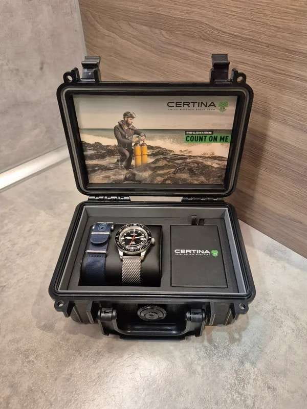 Оригинальный чёрный циферблат понравится ценителям ретро-дизайна. В комплекте с тканевым ремешком вы получаете дополнительный вариант из стали. Меняя их, вы можете экспериментировать с разными стилями. Уникальностью обладает не только аксессуар, но и упаковка, сделанная в виде бокса для дайвинга. Часы комплектуются автоматическим механизмом ETA Powermatic 80Powermatic 80Эксклюзивный калибр от швейцарской компании ETA с увеличенным запасом хода до 80 часов за счёт удлинённой заводной пружины. Характеризуется улучшенной системой спуска со сниженным трением. с 80-часовым запасом хода. Технология DS ConceptDS ConceptDouble Security Concept, обозначает двойную надёжность и безупречную точность часов Certina. Двойная система защиты подразумевает обеспечение максимальной устойчивости к ударам и высоких показателей водонепроницаемости.. Стекло с покрытием Nex scratchguard, устойчивым к царапинам. Вращающийся безельБезельВнешний ободок, закрепляющий стекло. В спортивных часах так называется поворотное кольцо с делениями на циферблате, выполняет роль таймера – замеряет отрезки времени на шкале. Неподвижный безель – элемент декора. Однонаправленно вращающийся безель на дайверских часах позволяет фиксировать моменты погружения и выныривания на поверхность.. Диаметр корпуса: 42,8 мм.