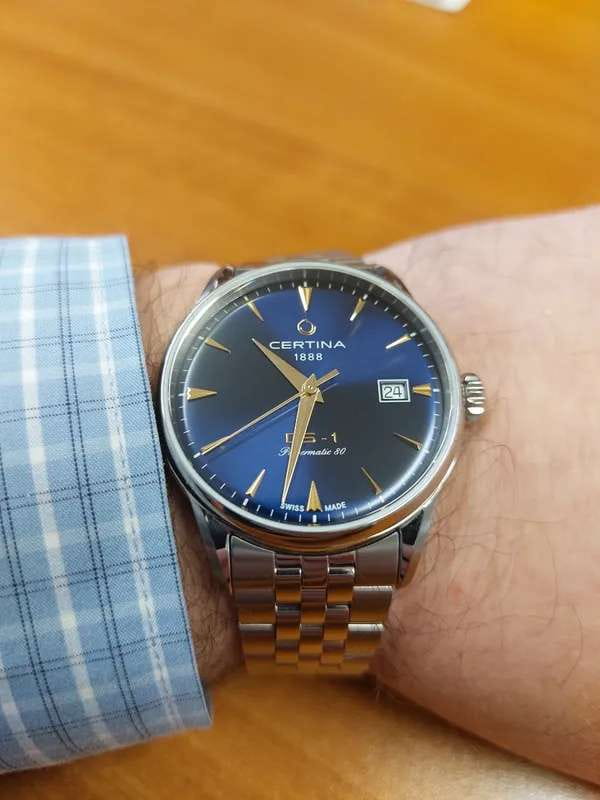 Швейцарские механические часы Certina DS-1 C029.207.11.041.00. Выпуклое сапфировое стеклоСапфировое стеклоПрочный и надёжный материал из кристалла сапфира синтетического происхождения, характеризующийся особой твёрдостью и устойчивостью к царапинам и повреждениям. с антибликовым покрытием. Класс водозащиты: 100 метров, позволит плавать, нырять и заниматься другими водными видами спорта. Корпус часов изготовлен из нержавеющей стали 316L. Стальной браслет на застёжке-бабочке с кнопкамиЗастёжка "бабочка"Такой вид застёжки дополняется предохранителями, помогающими избежать случайного раскрытия браслета. Обладают изящным исполнением. .
