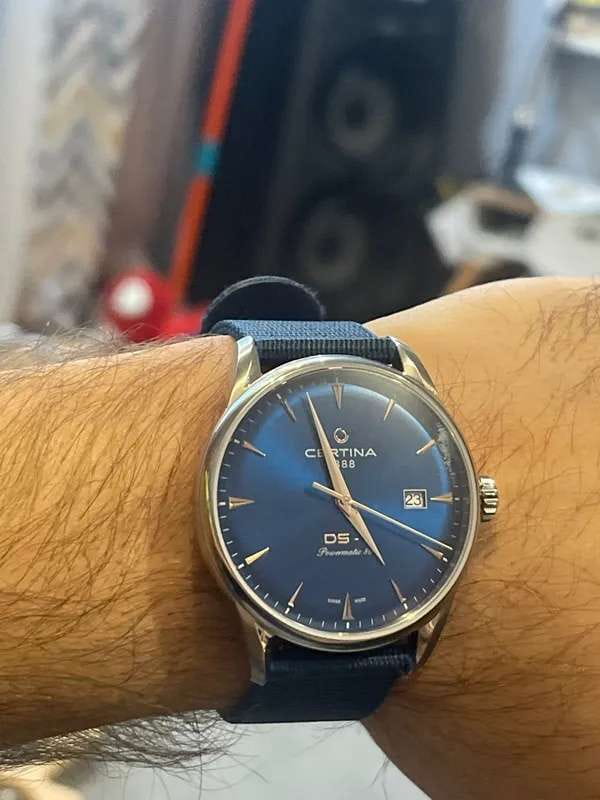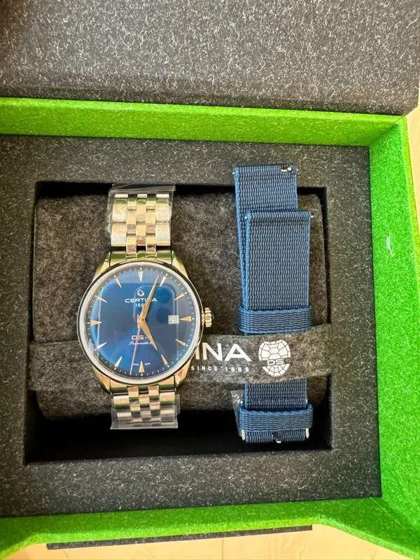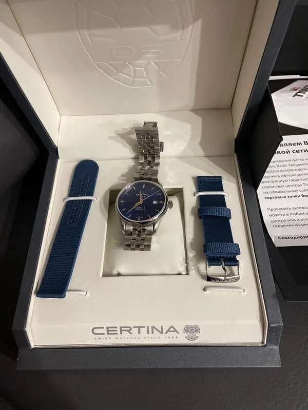 Аксессуар выполнен в классическом стиле, элегантно смотрится сатинированный синий циферблат. Надёжный стальной корпус дополнен уплотнительным кольцом в соответствии с концепцией Двойной Надёжности DSDS ConceptDouble Security Concept, обозначает двойную надёжность и безупречную точность часов Certina. Двойная система защиты подразумевает обеспечение максимальной устойчивости к ударам и высоких показателей водонепроницаемости.. Он защищает швейцарский автоматический механизм ETA Powermatic 80Powermatic 80Эксклюзивный калибр от швейцарской компании ETA с увеличенным запасом хода до 80 часов за счёт удлинённой заводной пружины. Характеризуется улучшенной системой спуска со сниженным трением. с увеличенным запасом хода до 80 часов. Калибр дополнен кремниевой спиралью Nivachron™, устраняющей действие магнитных полей. Выпуклое сапфировое стекло имеет покрытие антиблик. Часы водонепроницаемы до 100 метров. Браслет оснащён системой быстрой замены. В нижней части циферблата размещена крупная апертура даты. Диаметр корпуса: 40 мм.