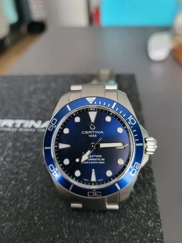 Швейцарские мужские механические часы Certina DS Action Diver Powermatic 80 C032.807.11.041.00 из коллекции DS Action отражают непревзойдённый стиль с дайверским характером. Модель имеет яркий акцент в виде синего циферблата. Крупная индикация времени позволяет считывать показания с циферблата в любой ситуации. Автоматический швейцарский калибр ETA Powermatic 80Powermatic 80Эксклюзивный калибр от швейцарской компании ETA с увеличенным запасом хода до 80 часов за счёт удлинённой заводной пружины. Характеризуется улучшенной системой спуска со сниженным трением. с резервом хода на 80 часов. Концепция DS ConceptDS ConceptDouble Security Concept, обозначает двойную надёжность и безупречную точность часов Certina. Двойная система защиты подразумевает обеспечение максимальной устойчивости к ударам и высоких показателей водонепроницаемости.. Сапфировое стекло. Алюминиевый вращающийся безельБезельВнешний ободок, закрепляющий стекло. В спортивных часах так называется поворотное кольцо с делениями на циферблате, выполняет роль таймера – замеряет отрезки времени на шкале. Неподвижный безель – элемент декора. Однонаправленно вращающийся безель на дайверских часах позволяет фиксировать моменты погружения и выныривания на поверхность.. Водонепроницаемость 300 метров. Люминесцентная подсветкаЛюминесцентное покрытиеПозволяет считывать показания времени в темноте. Производители наносят на стрелки, часовые индексы, безель или поверхность циферблата светонакопительный состав, дающий холодное свечение.. Стальной браслет с застёжкой, имеющей удлинение для дайверовУдлинение для дайверовЗастёжка с удлинением для дайверов представляет собой безопасное крепление, которое позволяет надевать часы поверх гидрокостюма. Гибкая застёжка удлиняется на 1-2 миллиметра.. Апертура даты. Диаметр корпуса: 38 мм. Производство и сборка: Швейцария.