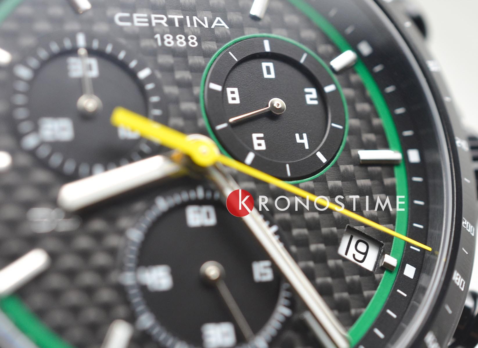 Мужские часы-хронографХронографФункция позволяет измерять отрезки времени с особой точностью: часы, минуты, секунды. Верным признаком хронографа является наличие на циферблате 3 дополнительных окошек-счётчиков. Certina DS-7 Chronograph Padel Edition by Marta Ortega C043.417.38.201.10. Корпус часов изготовлен из нержавеющей стали 316L с PVD-покрытиемPVDУльтратонкое покрытие наносится в технике вакуумного напыления, сочетает в себе нитрид титана особой прочности со слоем золота или оксида хрома. Несёт в себе декоративную или защитную функцию.. Под твердым сапфировым стекломСапфировое стеклоПрочный и надёжный материал из кристалла сапфира синтетического происхождения, характеризующийся особой твёрдостью и устойчивостью к царапинам и повреждениям. с антибликовым покрытиемАнтибликовое покрытиеСлой оксида металла в 0,13-0,3 микрон, благодаря которому стекло часов не бликует и не отражает свет. Антибликовое покрытие уменьшает отражение света в 10 раз, обеспечивая отличную читаемость показателей циферблата. находится черный циферблат и на котором вы найдете окошко даты в положении 4 часа, а также маркировку, покрытую люминесцентным покрытиемЛюминесцентное покрытиеПозволяет считывать показания времени в темноте. Производители наносят на стрелки, часовые индексы, безель или поверхность циферблата светонакопительный состав, дающий холодное свечение. Super-LumiNova. Класс водозащиты: 100 метров, позволит плавать, нырять и заниматься другими водными видами спорта. Тканевый ремешок на застёжке-бабочке с кнопкамиЗастёжка "бабочка"Такой вид застёжки дополняется предохранителями, помогающими избежать случайного раскрытия браслета. Обладают изящным исполнением. .ТахиметрТахиметрРазмеченная шкала, располагается на ободке или безеле часов. Тахиметр позволяет рассчитать скорость на определённом участке пути, расстояние измеряется в километрах или милях..