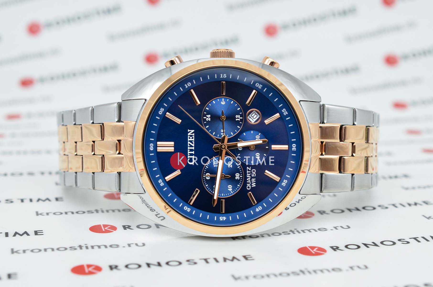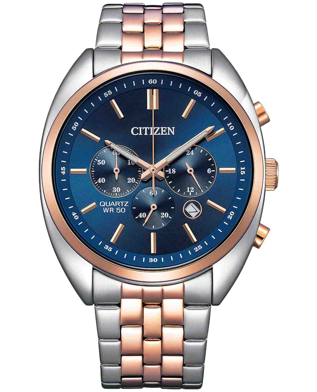 Citizen Chronograph AN8216-50L часы-хронографХронографФункция позволяет измерять отрезки времени с особой точностью: часы, минуты, секунды. Верным признаком хронографа является наличие на циферблате 3 дополнительных окошек-счётчиков. с секундомеромСекундомерСекундоме́р — прибор, способный измерять интервалы времени с точностью до долей секунды.. Корпус из нержавеющей стали диаметром 42 мм идеально сбалансирован. Минеральное стеклоМинеральное стеклоМинеральное стекло представляет собой искусственно выращенный минерал кварца. Такое стекло отличается особой устойчивостью к повреждениям и царапинам. Уступает по некоторым качествам сапфировому стеклу. обеспечивает отличную защиту циферблата от царапин. Часы работают на основе кварцевого механизма. Стальной браслет на раскладной застёжкеРаскладная застёжкаТакой тип застёжки используется только на браслетах из металла. Она никогда не раскрывается полностью, происходит разделение на 2 и более частей. Раскладывающая застёжка снизит вероятность потери часов к минимуму. идеально дополняют дизайн часов, обеспечивая комфортное ношение. БезельБезельВнешний ободок, закрепляющий стекло. В спортивных часах так называется поворотное кольцо с делениями на циферблате, выполняет роль таймера – замеряет отрезки времени на шкале. Неподвижный безель – элемент декора. Однонаправленно вращающийся безель на дайверских часах позволяет фиксировать моменты погружения и выныривания на поверхность. с IP-покрытиемIP-покрытиеМетод ионного напыления. Демонстрирует повышенную устойчивость к истиранию, окислению и химическим веществам. Под воздействием высокого давления и температуры около 1500°C молекулы металла надёжно соединяются с частицами корпуса часов.. Секундомер с точностью показаний 1c и временем измерения 60мин. Окошко даты находится между часовыми отметками 4 и 5. 12-ти и 24-х часовой формат времени отображается на отдельном циферблате. Циферблат с метками в виде штрихов выполнен по технологии Sunray (солнечные лучи). Заводная головка с защитой. Часы обладают водонепроницаемостью до 50WR, что делает их идеальными для повседневной носки.