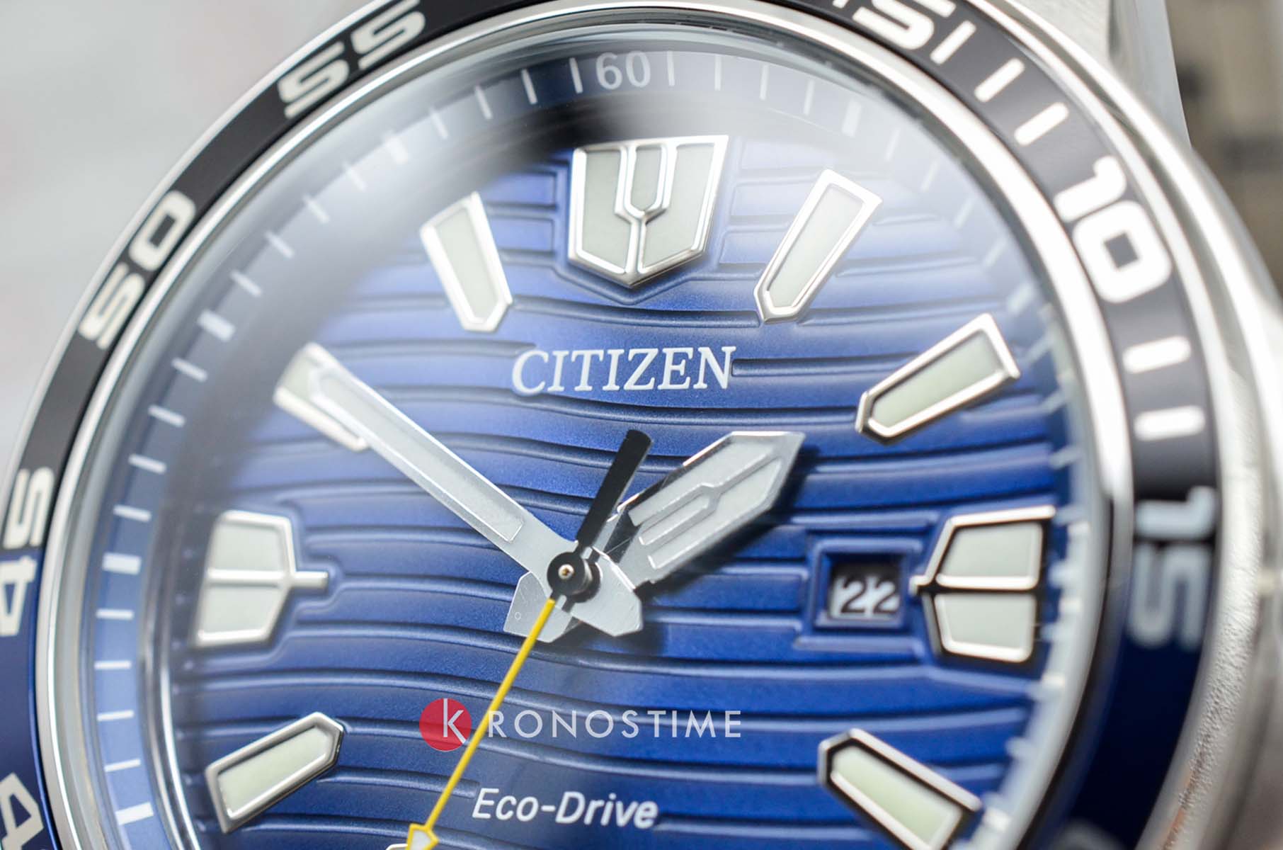 Часы Citizen AW1525-81L – это стильная и надежная модель японского производства, идеально подходящая для активного образа жизни. Корпус выполнен из высококачественной нержавеющей стали, в то время как на безельБезельВнешний ободок, закрепляющий стекло. В спортивных часах так называется поворотное кольцо с делениями на циферблате, выполняет роль таймера – замеряет отрезки времени на шкале. Неподвижный безель – элемент декора. Однонаправленно вращающийся безель на дайверских часах позволяет фиксировать моменты погружения и выныривания на поверхность. нанесено черное и синее PVD-покрытиеPVDУльтратонкое покрытие наносится в технике вакуумного напыления, сочетает в себе нитрид титана особой прочности со слоем золота или оксида хрома. Несёт в себе декоративную или защитную функцию., браслет также стальной. Синий циферблат украшен метками в виде штрихов и оснащен календарем с окошком даты. Защиту от повреждений обеспечивает прочное минеральное стеклоМинеральное стеклоМинеральное стекло представляет собой искусственно выращенный минерал кварца. Такое стекло отличается особой устойчивостью к повреждениям и царапинам. Уступает по некоторым качествам сапфировому стеклу., а водонепроницаемость до 100 метров позволяет не снимать часы во время плавания и занятий спортом. Внутри установлен надежный кварцевый механизм Citizen J810 с инновационной системой Eco-Drive, которая питается от солнечной энергии и не требует замены батарейки, обеспечивая запас хода до 240 дней. Стрелки и часовые метки с люминесцентным покрытиемЛюминесцентное покрытиеПозволяет считывать показания времени в темноте. Производители наносят на стрелки, часовые индексы, безель или поверхность циферблата светонакопительный состав, дающий холодное свечение. обеспечивают отличную читаемость даже в темноте. Функция индикации заряда EOLEOLПредставляет собой систему, уведомляющую владельца часов о необходимости замены элемента питания. За 2 недели до полного разряда батарейки секундная стрелка перестаёт ходить чётко и начинает перепрыгивать на 3-4 деления. подскажет, когда потребуется подзарядка. Корпус диаметром 45,9 мм, толщина 11,8 мм, ширина браслета 22 мм, вес модели составляет 160 граммов. Завинчивающаяся задняя крышка украшена фирменной гравировкой Eco-Drive, а заводная головка оснащена защитой. Надежная раскладная застёжкаРаскладная застёжкаТакой тип застёжки используется только на браслетах из металла. Она никогда не раскрывается полностью, происходит разделение на 2 и более частей. Раскладывающая застёжка снизит вероятность потери часов к минимуму. браслета с системой блокировки гарантирует комфортное и безопасное ношение.