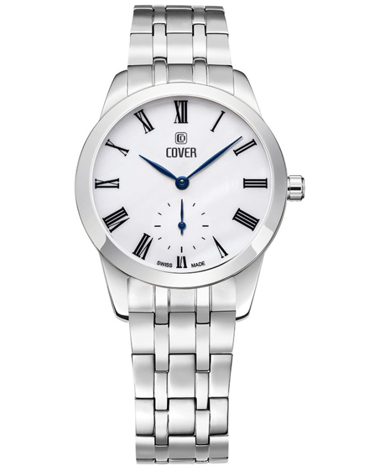 Часы Cover Nobila CO195.07 - это аксессуар для истинных леди из коллекции Nobila. Часы работают на кварцевом калибре Ronda. Белый циферблат украшен печатными римскими цифрами и субдиском малой секундной стрелки на «6 часах» и защищен минеральным стекломМинеральное стеклоМинеральное стекло представляет собой искусственно выращенный минерал кварца. Такое стекло отличается особой устойчивостью к повреждениям и царапинам. Уступает по некоторым качествам сапфировому стеклу. с сапфировым напылением. Корпус из нержавеющей стали диаметром 32 мм с широким полированным безелемБезельВнешний ободок, закрепляющий стекло. В спортивных часах так называется поворотное кольцо с делениями на циферблате, выполняет роль таймера – замеряет отрезки времени на шкале. Неподвижный безель – элемент декора. Однонаправленно вращающийся безель на дайверских часах позволяет фиксировать моменты погружения и выныривания на поверхность.. Интегрированный браслет состоит из 5 звеньев, на раскладной застёжкеРаскладная застёжкаТакой тип застёжки используется только на браслетах из металла. Она никогда не раскрывается полностью, происходит разделение на 2 и более частей. Раскладывающая застёжка снизит вероятность потери часов к минимуму.. Часы имеют маркировку «Swiss Made».