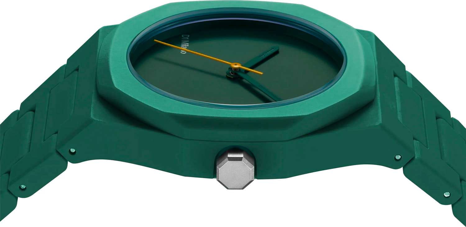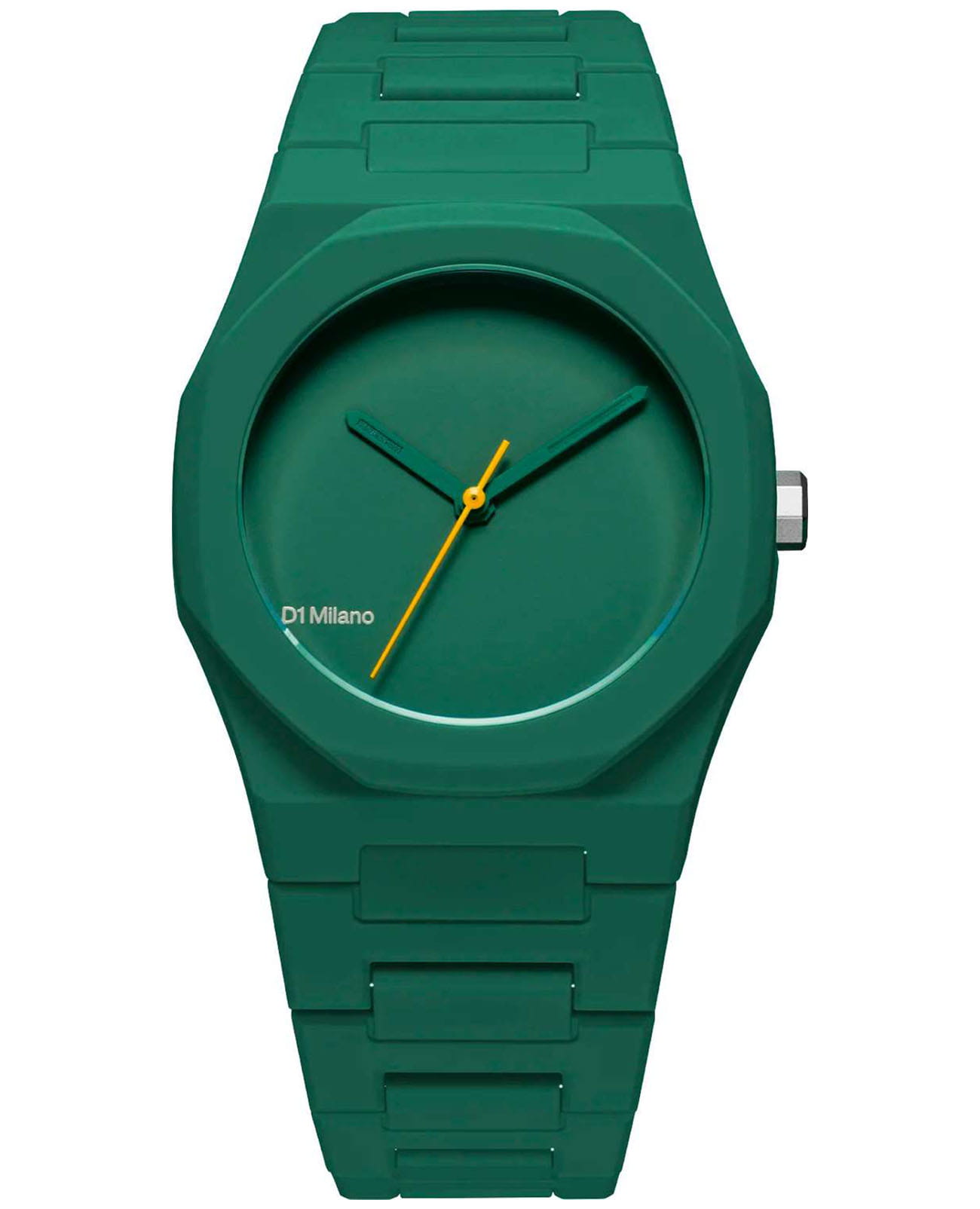 Часы D1 Milano Polycarbon PCBU10 – молодежные часы в стиле унисекс для повседневных образов, стильные и комфортные.  Модель имеет зеленый корпус и браслет из поликарбоната с покрытием Софт-Тач.. Циферблат лаконичный с индексами в виде штрихов, защищен минеральным стекломМинеральное стеклоМинеральное стекло представляет собой искусственно выращенный минерал кварца. Такое стекло отличается особой устойчивостью к повреждениям и царапинам. Уступает по некоторым качествам сапфировому стеклу. с антибликовым покрытием. Стальная задняя крышка на 4 винтах.  Пластиковый браслет на застёжке-бабочке с кнопкамиЗастёжка "бабочка"Такой вид застёжки дополняется предохранителями, помогающими избежать случайного раскрытия браслета. Обладают изящным исполнением. .