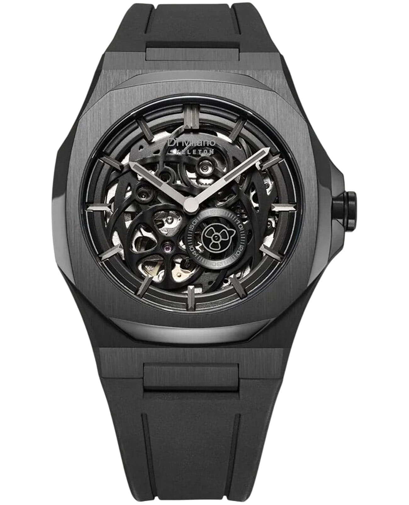 Часы D1 Milano Skeleton SKRJ17 — это эффектные механические мужские часы, разработанные для ценителей уникальных аксессуаров. Их утонченный дизайн и высокое качество исполнения делают эти часы незаменимым элементом вашего стиля. Изготовленные в Италии, они оснащены надежным механизмом Miyota 8N40 с автоподзаводом, обеспечивающими запас хода до 42 часа. Частота работы механизма составляет 21600 полуколебаний в час. Часы имеют корпус из нержавеющей стали с PVD-покрытиемPVDУльтратонкое покрытие наносится в технике вакуумного напыления, сочетает в себе нитрид титана особой прочности со слоем золота или оксида хрома. Несёт в себе декоративную или защитную функцию. черного цвета, что гарантирует долговечность и стойкость к внешним воздействиям. Скелетонизированный циферблат защищен сапфировым стекломСапфировое стеклоПрочный и надёжный материал из кристалла сапфира синтетического происхождения, характеризующийся особой твёрдостью и устойчивостью к царапинам и повреждениям. с антибликовым покрытиемАнтибликовое покрытиеСлой оксида металла в 0,13-0,3 микрон, благодаря которому стекло часов не бликует и не отражает свет. Антибликовое покрытие уменьшает отражение света в 10 раз, обеспечивая отличную читаемость показателей циферблата., подчеркивающим элегантность и изысканность модели и защищает от царапин. Стрелки с люминесцентным покрытиемЛюминесцентное покрытиеПозволяет считывать показания времени в темноте. Производители наносят на стрелки, часовые индексы, безель или поверхность циферблата светонакопительный состав, дающий холодное свечение.. Метки в виде штрихов и прозрачная задняя крышка, закрепленная на 8 винтах, придают часам особый шарм. Каучуковый ремешок с классической застежкой обеспечивает комфортное и надежное ношение. Водозащита до 50 WR делает эти часы подходящими для повседневного использования.
