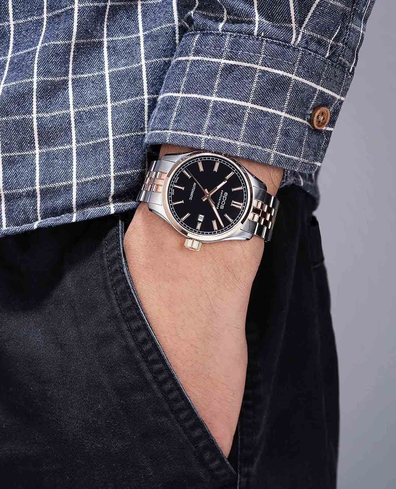 Мужские швейцарские механические часы с автоподзаводом Epos Passion 3501.132.34.15.44. Сапфировое стеклоСапфировое стеклоПрочный и надёжный материал из кристалла сапфира синтетического происхождения, характеризующийся особой твёрдостью и устойчивостью к царапинам и повреждениям. устойчивое к появлению царапин, обладающее высокой прозрачностью. Корпус и браслет часов изготовлен из нержавеющей стали с частичным PVDPVDУльтратонкое покрытие наносится в технике вакуумного напыления, сочетает в себе нитрид титана особой прочности со слоем золота или оксида хрома. Несёт в себе декоративную или защитную функцию. покрытием. Неподвижный безельБезельВнешний ободок, закрепляющий стекло. В спортивных часах так называется поворотное кольцо с делениями на циферблате, выполняет роль таймера – замеряет отрезки времени на шкале. Неподвижный безель – элемент декора. Однонаправленно вращающийся безель на дайверских часах позволяет фиксировать моменты погружения и выныривания на поверхность. из нержавеющей стали с PVDPVDУльтратонкое покрытие наносится в технике вакуумного напыления, сочетает в себе нитрид титана особой прочности со слоем золота или оксида хрома. Несёт в себе декоративную или защитную функцию. покрытием. Стрелки и метки с люминесцентной подсветкойЛюминесцентное покрытиеПозволяет считывать показания времени в темноте. Производители наносят на стрелки, часовые индексы, безель или поверхность циферблата светонакопительный состав, дающий холодное свечение.. Окошко даты находится в положении 3 часов. Прозрачная задняя крышка. Класс водозащиты: 100 метров, позволит плавать, нырять и заниматься другими водными видами спорта. Стальной браслет на раскладной застёжкеРаскладная застёжкаТакой тип застёжки используется только на браслетах из металла. Она никогда не раскрывается полностью, происходит разделение на 2 и более частей. Раскладывающая застёжка снизит вероятность потери часов к минимуму..