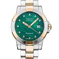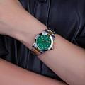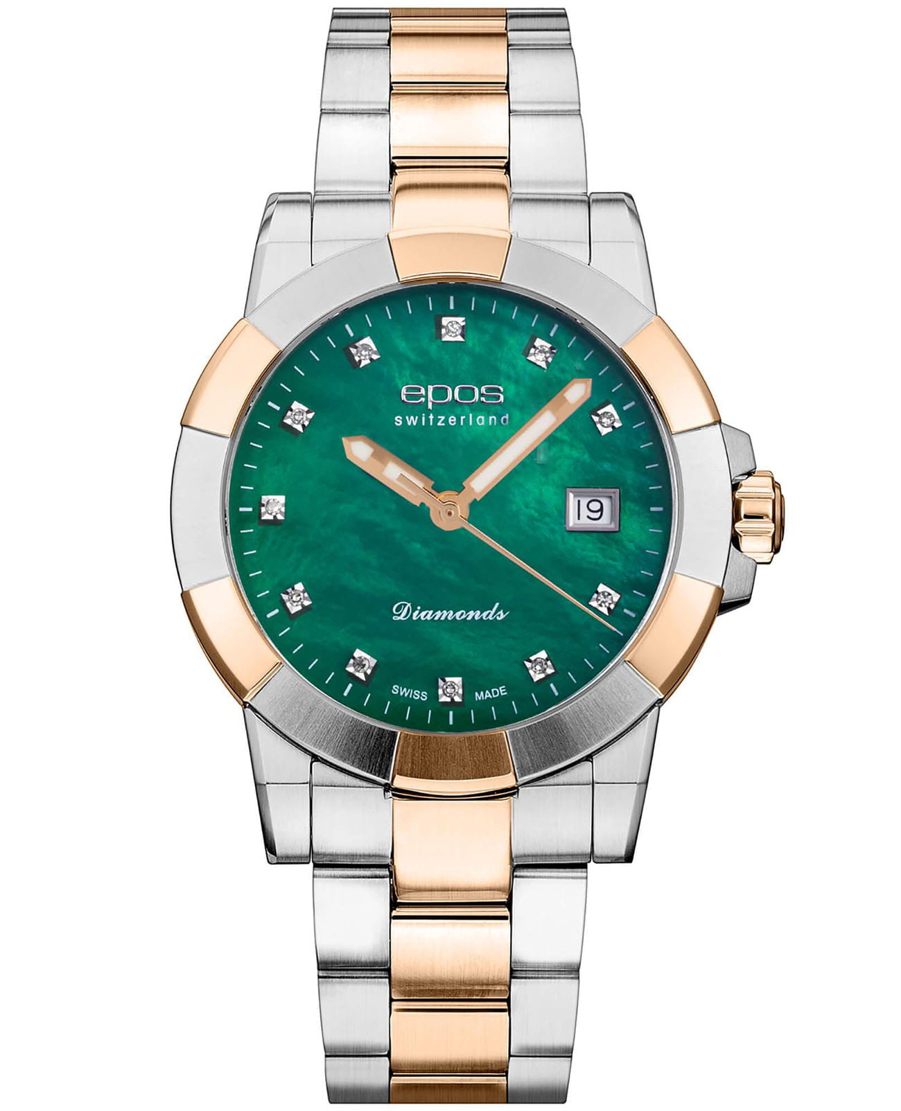 Женские кварцевые часы Epos из коллекции Ladies Diamonds — это элегантный аксессуар, сочетающий швейцарское качество и изысканный дизайн. Корпус диаметром 36 мм и толщиной 9 мм выполнен из нержавеющей стали 316L, безель с частичным PVD-покрытиемPVDУльтратонкое покрытие наносится в технике вакуумного напыления, сочетает в себе нитрид титана особой прочности со слоем золота или оксида хрома. Несёт в себе декоративную или защитную функцию. розового золота. Циферблат с перламутровой вставкой зелёного оттенка выполнен по технологии «солнечные лучи» и украшен синтетическими бриллиантами. Циферблат защищён сапфировым стекломСапфировое стеклоПрочный и надёжный материал из кристалла сапфира синтетического происхождения, характеризующийся особой твёрдостью и устойчивостью к царапинам и повреждениям.. Метки в виде точек инкрустированы бриллиантами. Стрелки с люминесцентным покрытиемЛюминесцентное покрытиеПозволяет считывать показания времени в темноте. Производители наносят на стрелки, часовые индексы, безель или поверхность циферблата светонакопительный состав, дающий холодное свечение., обеспечивающим хорошую читаемость в темноте. Окошко даты расположено в положении 3 часов. Механизм — швейцарский кварцевый калибр Ronda 705. Часы оснащены стальным браслетом комбинированного цвета на раскладной застёжкеРаскладная застёжкаТакой тип застёжки используется только на браслетах из металла. Она никогда не раскрывается полностью, происходит разделение на 2 и более частей. Раскладывающая застёжка снизит вероятность потери часов к минимуму.. Водонепроницаемость 50 м позволяет использовать часы в повседневных условиях. Гарантия — 24 месяца. Идеальный выбор для тех, кто ценит роскошь, стиль и точность.