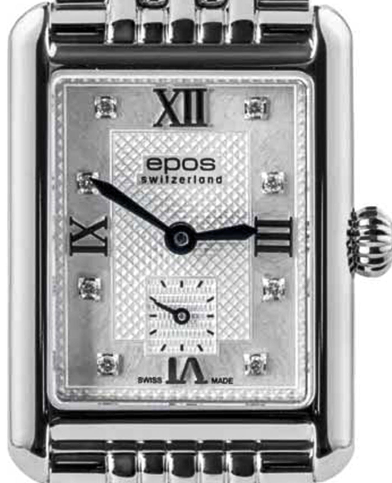Женские кварцевые часы Epos — это элегантный аксессуар с прямоугольным корпусом размером 21×24 мм и толщиной 7 мм, выполненным из нержавеющей стали 316L. Циферблат белого цвета оформлен римскими цифрами и точками, инкрустированными 8 синтетическими бриллиантами. Секундная стрелка вынесена на отдельный субциферблат, что придаёт дизайну изысканности. Циферблат защищён сапфировым стекломСапфировое стеклоПрочный и надёжный материал из кристалла сапфира синтетического происхождения, характеризующийся особой твёрдостью и устойчивостью к царапинам и повреждениям., устойчивым к царапинам. Механизм — кварцевый калибр Ronda 1064. Часы оснащены стальным браслетом на застёжке «бабочка» с кнопкамиЗастёжка "бабочка"Такой вид застёжки дополняется предохранителями, помогающими избежать случайного раскрытия браслета. Обладают изящным исполнением. . Водонепроницаемость 30 м позволяет использовать часы в повседневных условиях. Гарантия — 24 месяца. Идеальный выбор для тех, кто ценит швейцарское качество, классический стиль и изящество.