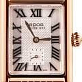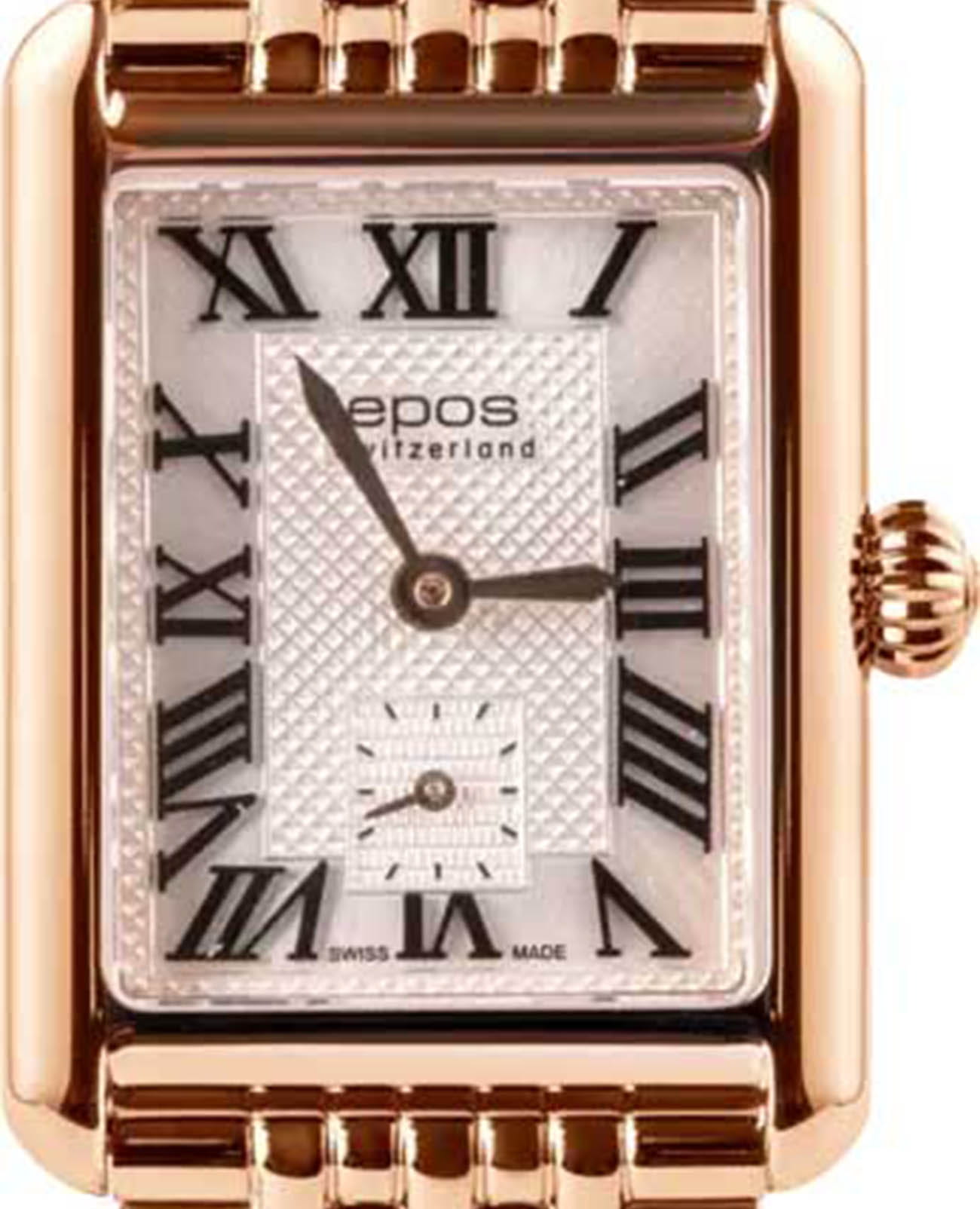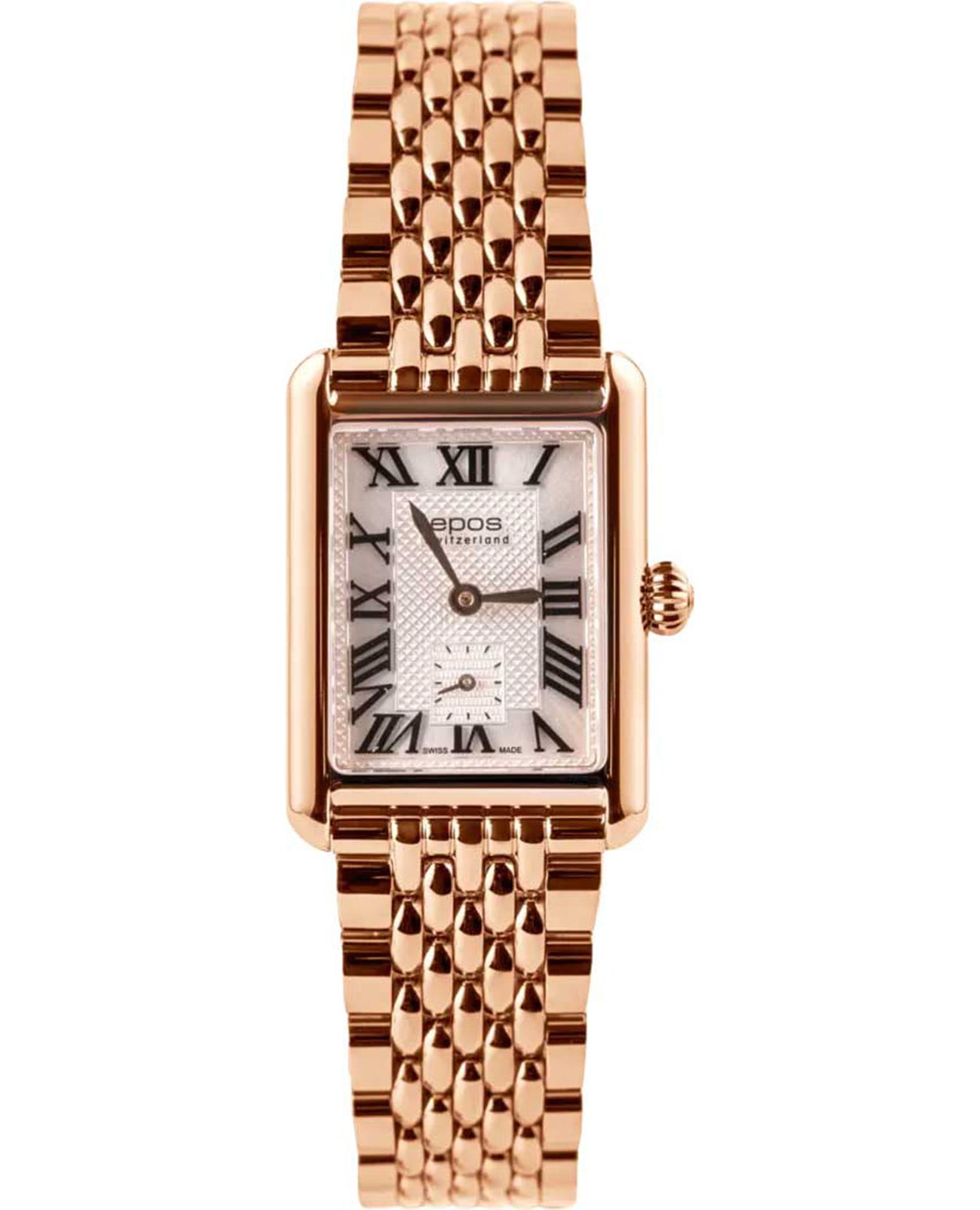Женские кварцевые часы Epos — это элегантный аксессуар с прямоугольным корпусом размером 21×24 мм и толщиной 7 мм, выполненным из нержавеющей стали 316L с PVD-покрытиемPVDУльтратонкое покрытие наносится в технике вакуумного напыления, сочетает в себе нитрид титана особой прочности со слоем золота или оксида хрома. Несёт в себе декоративную или защитную функцию. розового золота. Циферблат белого цвета оформлен римскими цифрами и индексами. Секундная стрелка вынесена на отдельный субциферблат, что придаёт дизайну изысканности. Циферблат защищён сапфировым стекломСапфировое стеклоПрочный и надёжный материал из кристалла сапфира синтетического происхождения, характеризующийся особой твёрдостью и устойчивостью к царапинам и повреждениям., устойчивым к царапинам. Механизм — кварцевый калибр Ronda 1064. Часы оснащены стальным браслетом с PVD-покрытиемPVDУльтратонкое покрытие наносится в технике вакуумного напыления, сочетает в себе нитрид титана особой прочности со слоем золота или оксида хрома. Несёт в себе декоративную или защитную функцию. на застёжке «бабочка» с кнопкамиЗастёжка "бабочка"Такой вид застёжки дополняется предохранителями, помогающими избежать случайного раскрытия браслета. Обладают изящным исполнением. . Водонепроницаемость 30 м позволяет использовать часы в повседневных условиях. Гарантия — 24 месяца. Идеальный выбор для тех, кто ценит швейцарское качество, классический стиль и изящество.