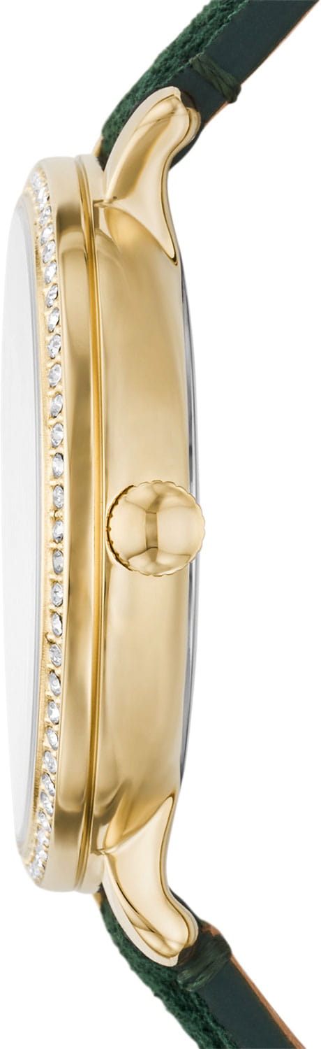 Американские женские наручные часы Fossil Jacqueline ES5244. Кварцевый механизм с высокой точностью. Класс водозащиты: 30 метров, позволит защитить корпус от случайных брызг или капель дождя. Индикатор дня и ночи на отдельном циферблате. Корпус часов изготовлен из стали с IP-покрытиемIP-покрытиеМетод ионного напыления. Демонстрирует повышенную устойчивость к истиранию, окислению и химическим веществам. Под воздействием высокого давления и температуры около 1500°C молекулы металла надёжно соединяются с частицами корпуса часов.. БезельБезельВнешний ободок, закрепляющий стекло. В спортивных часах так называется поворотное кольцо с делениями на циферблате, выполняет роль таймера – замеряет отрезки времени на шкале. Неподвижный безель – элемент декора. Однонаправленно вращающийся безель на дайверских часах позволяет фиксировать моменты погружения и выныривания на поверхность. украшен кристаллами.