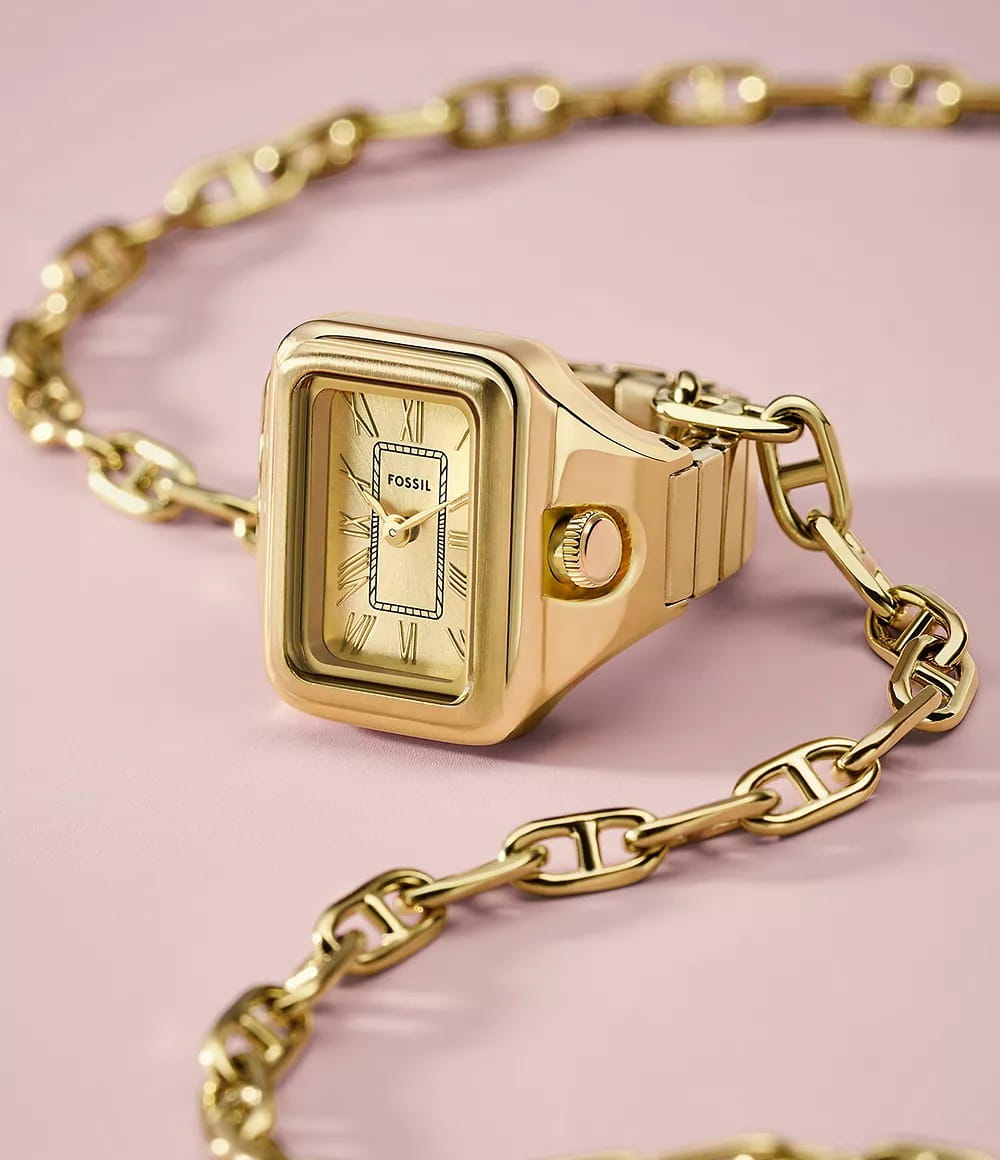 Уникальные часы-кольцо с минеральным стекломМинеральное стеклоМинеральное стекло представляет собой искусственно выращенный минерал кварца. Такое стекло отличается особой устойчивостью к повреждениям и царапинам. Уступает по некоторым качествам сапфировому стеклу. Fossil Raquel Ring ES5343, кварцевый механизм с высокой точностью. Корпус и браслет часов изготовлены из нержавеющей стали с IP-покрытиемIP-покрытиеМетод ионного напыления. Демонстрирует повышенную устойчивость к истиранию, окислению и химическим веществам. Под воздействием высокого давления и температуры около 1500°C молекулы металла надёжно соединяются с частицами корпуса часов.. Класс водозащиты: 50 метров, позволит защитить корпус от случайных брызг или капель дождя. Циферблат выполнен с метками в виде штрихов. С помощью расширительного ремешка Вы сможете надеть модель на любой палец.