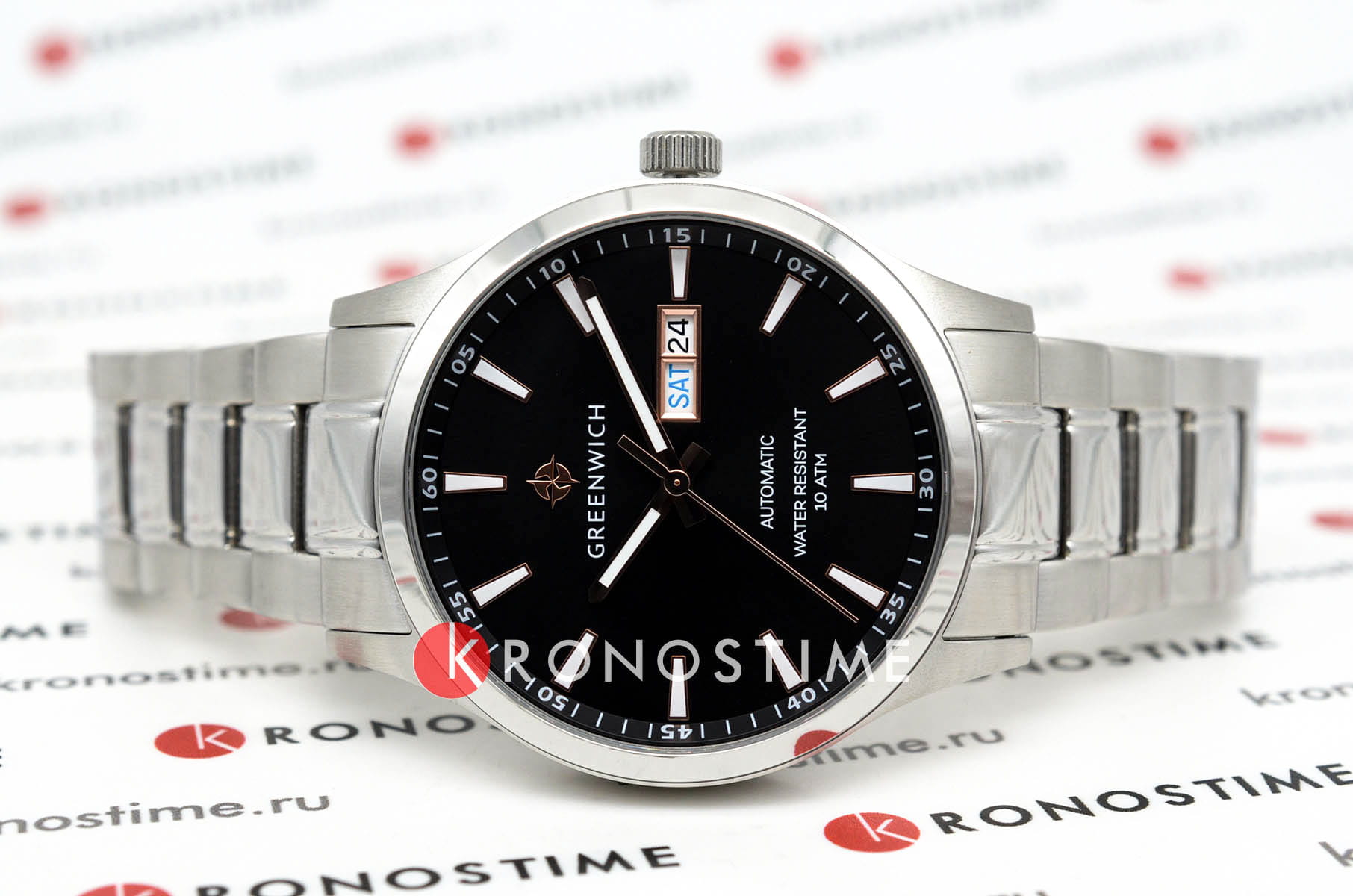 Мужские часы Greenwich Good Luck GW 054.10.30, механический механизм (автоматический калибр) с минеральным стекломМинеральное стеклоМинеральное стекло представляет собой искусственно выращенный минерал кварца. Такое стекло отличается особой устойчивостью к повреждениям и царапинам. Уступает по некоторым качествам сапфировому стеклу.. Корпус из нержавеющей стали. Стрелки и метки с люминесцентным покрытиемЛюминесцентное покрытиеПозволяет считывать показания времени в темноте. Производители наносят на стрелки, часовые индексы, безель или поверхность циферблата светонакопительный состав, дающий холодное свечение.. Окошко даты и дня недели находится в положении 3 часа. Класс водозащиты: 100 метров, позволит плавать, нырять и заниматься другими водными видами спорта. Стальной браслет на раскладной застёжкеРаскладная застёжкаТакой тип застёжки используется только на браслетах из металла. Она никогда не раскрывается полностью, происходит разделение на 2 и более частей. Раскладывающая застёжка снизит вероятность потери часов к минимуму..