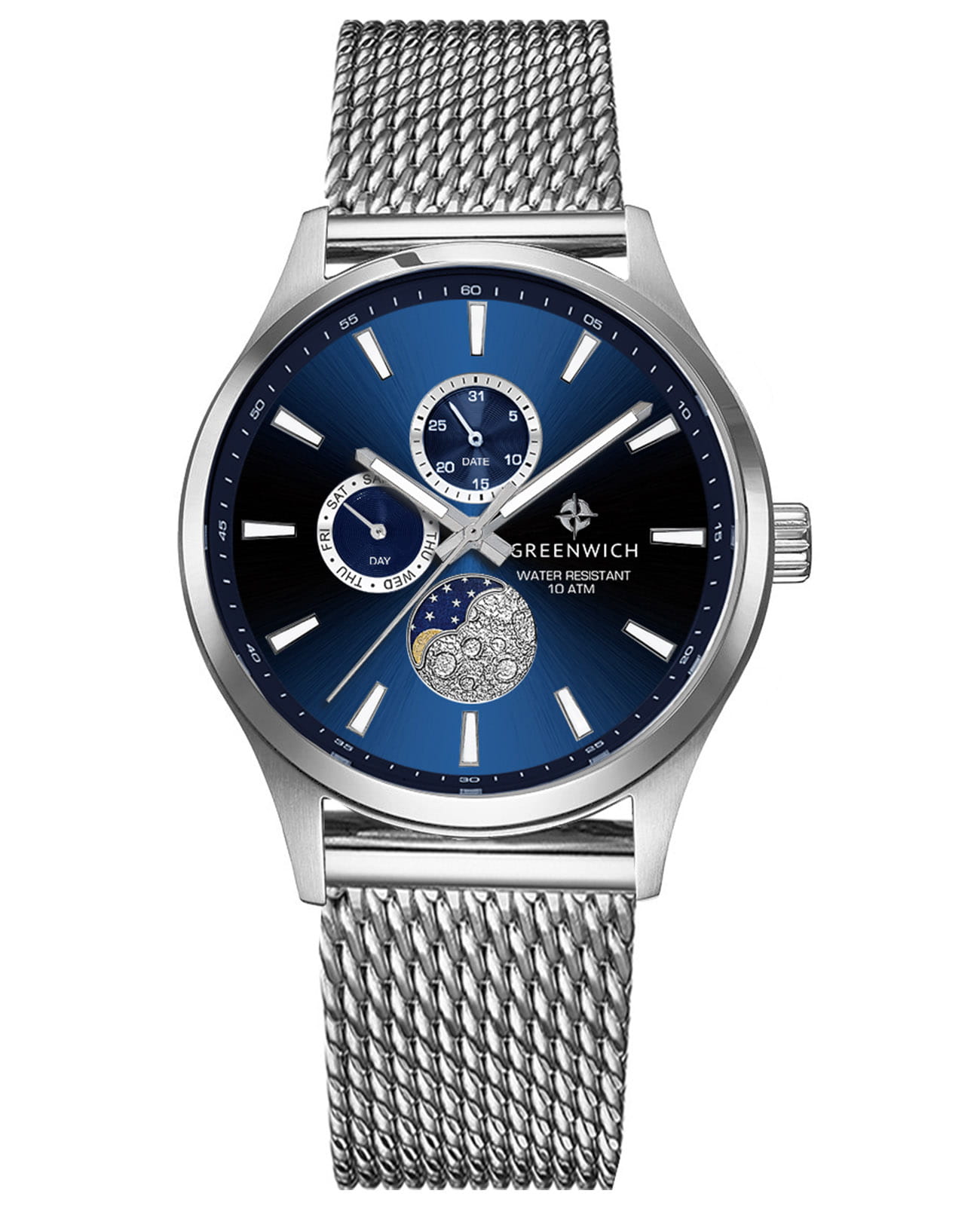Мужские английские часы с лунным календарем Greenwich Moon Walker GW 058.19.36, кварцевый механизм с высокой точностью. Класс водозащиты: 100 метров, позволит плавать, нырять и заниматься другими водными видами спорта. Корпус часов изготовлен из стали. В позиции «6 часов» расположен индикатор лунных фаз. Его украшением служит элемент с объемным рисунком, напоминающем изрытую кратерами поверхность спутника нашей планеты. Крупные стрелки и риски видны при любых условиях благодаря люминесцентному покрытиюЛюминесцентное покрытиеПозволяет считывать показания времени в темноте. Производители наносят на стрелки, часовые индексы, безель или поверхность циферблата светонакопительный состав, дающий холодное свечение., которое в темноте светится приятным для глаз зеленоватым свечением.