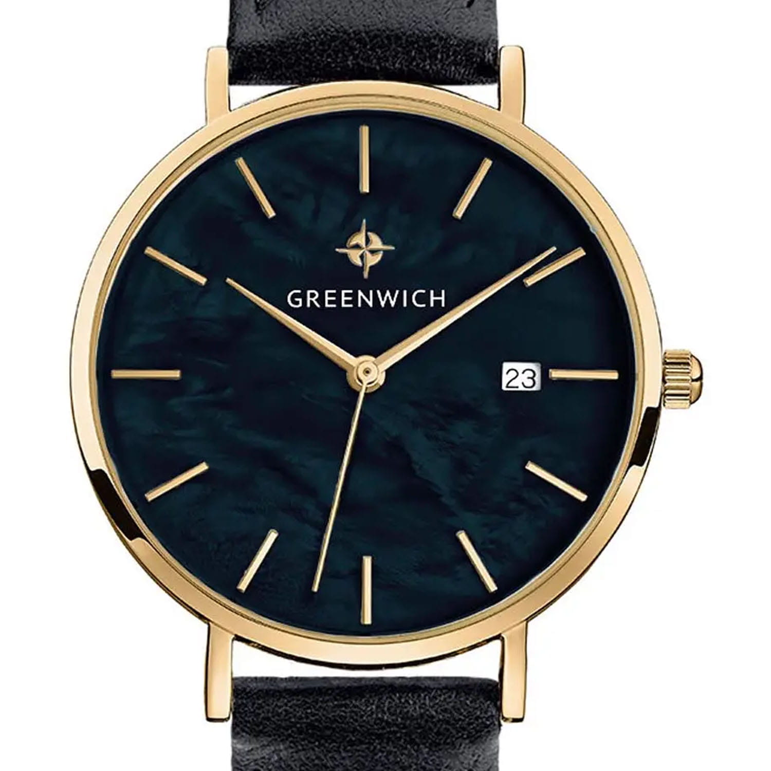 Женские наручные часы Greenwich GW 301.21.51 помогут дополнить образ элегантной особы, модель в лаконичном исполнении подойдёт для повседневной носки. Корпус часов изготовлен из нержавеющей гипоаллергенной стали, которая дополнена PVDPVDУльтратонкое покрытие наносится в технике вакуумного напыления, сочетает в себе нитрид титана особой прочности со слоем золота или оксида хрома. Несёт в себе декоративную или защитную функцию. покрытием из желтого золота. Нижняя часть корпуса заужена. Он выглядит тонким и изящно смотрится на руке. Размер корпуса 35 мм. В часах используется японский кварцевый механизм. Циферблат часов выполнен из натурального перламутра черного цвета, поэтому каждая модель уникальна и неповторима. Перламутр – это камень органического происхождения, получаемый из раковин моллюсков. Рисунок каждой раковины прекрасен и индивидуален. В процессе производства часть раковины срезается и наклеивается на латунную часть циферблата. На циферблате расположены часовая, минутная, секундная стрелки и индикатор даты. Индексы часов изготовлены вручную и закреплены на двух штифтах. Циферблат надежно защищен минеральным стеклом. На часах установлен черный ремешок из натуральной кожи. Логотип марки – изображение «розы ветров» - символизирует удачу и новые открытия. Он расположен на циферблате, заводной головке и внутренней части ремешка. Задняя крышка часов украшена изображениями «розы ветров» и корабля, который является символом марки Greenwich