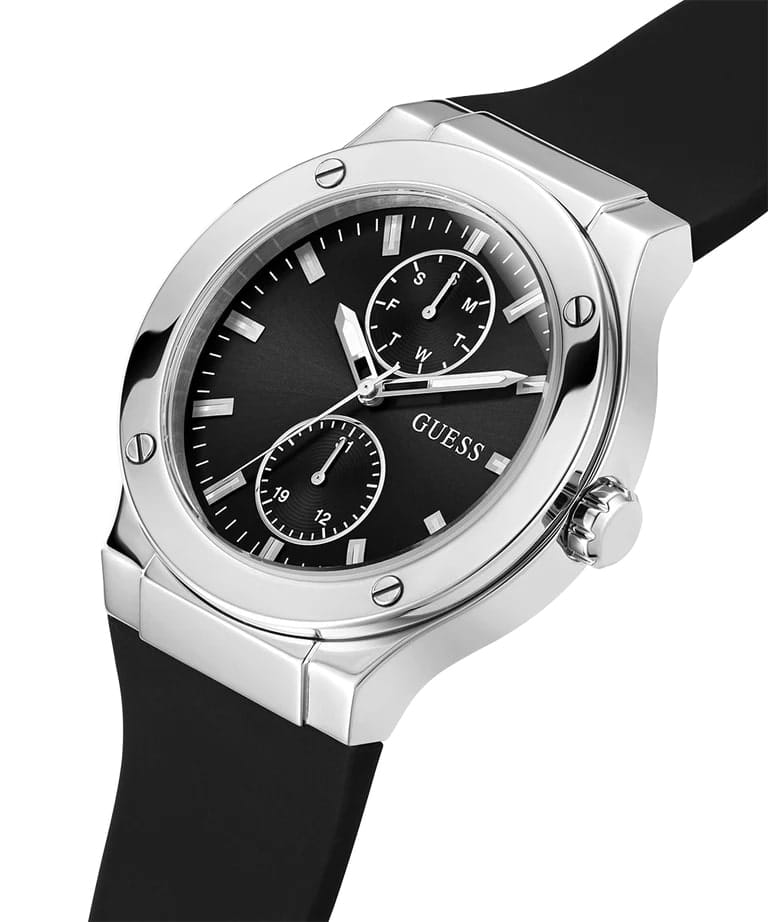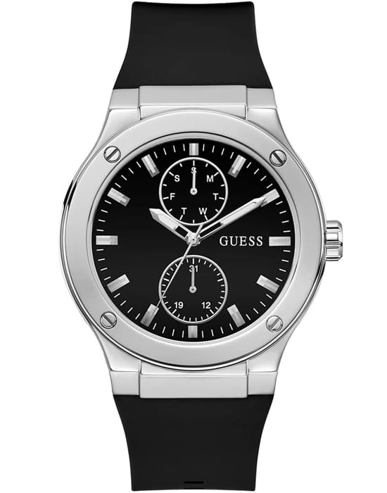 Мужские наручные часы Guess Dress Steel GW0493G3 с минеральным стекломМинеральное стеклоМинеральное стекло представляет собой искусственно выращенный минерал кварца. Такое стекло отличается особой устойчивостью к повреждениям и царапинам. Уступает по некоторым качествам сапфировому стеклу., кварцевый механизм с высокой точностью. Корпус часов изготовлен из нержавеющей стали. Стрелки и метки с люминесцентным покрытиемЛюминесцентное покрытиеПозволяет считывать показания времени в темноте. Производители наносят на стрелки, часовые индексы, безель или поверхность циферблата светонакопительный состав, дающий холодное свечение.. Класс водозащиты: 50 метров, позволит защитить корпус от случайных брызг или капель дождя. Силиконовый ремешок на стандартной застёжке.