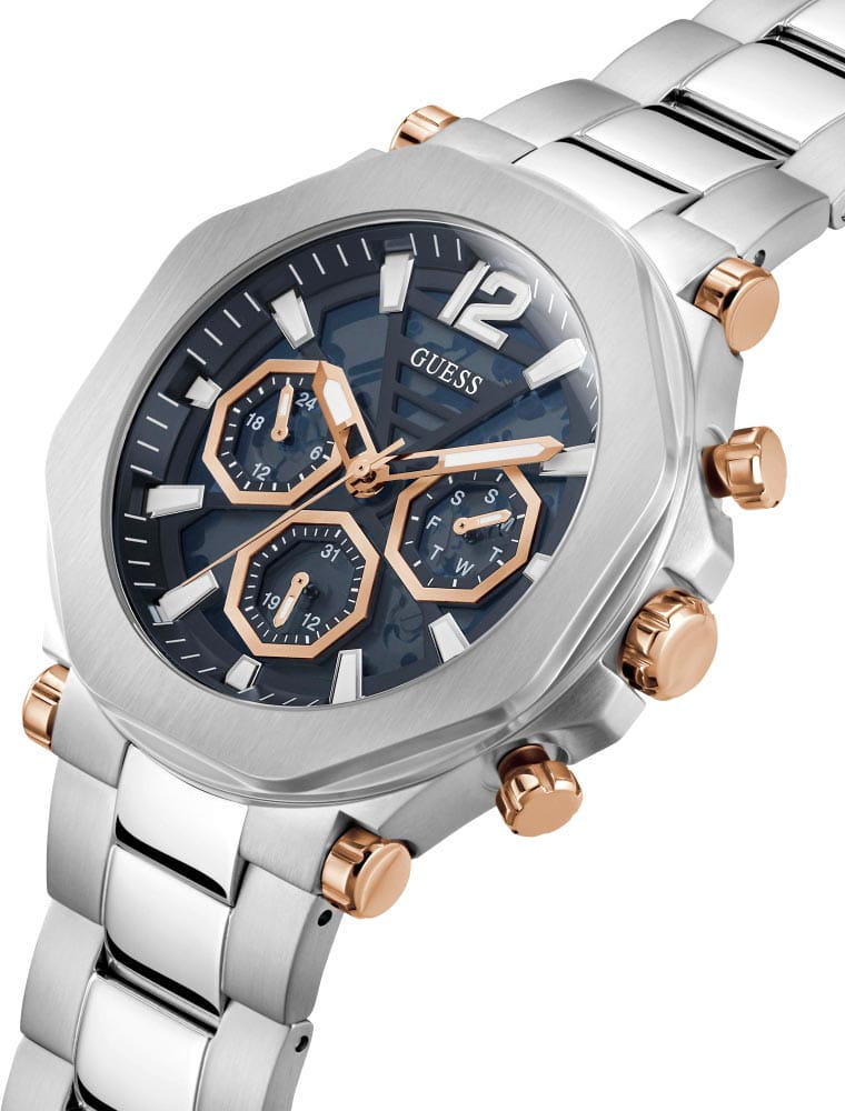 Мужские наручные часы Guess Dress Steel GW0539G1 с минеральным стекломМинеральное стеклоМинеральное стекло представляет собой искусственно выращенный минерал кварца. Такое стекло отличается особой устойчивостью к повреждениям и царапинам. Уступает по некоторым качествам сапфировому стеклу., кварцевый механизм с высокой точностью. Корпус часов изготовлен из стали. Стрелки и метки с люминесцентным покрытиемЛюминесцентное покрытиеПозволяет считывать показания времени в темноте. Производители наносят на стрелки, часовые индексы, безель или поверхность циферблата светонакопительный состав, дающий холодное свечение.. Класс водозащиты: 50 метров, позволит защитить корпус от случайных брызг или капель дождя. Браслет с раскладной застёжкойРаскладная застёжкаТакой тип застёжки используется только на браслетах из металла. Она никогда не раскрывается полностью, происходит разделение на 2 и более частей. Раскладывающая застёжка снизит вероятность потери часов к минимуму..