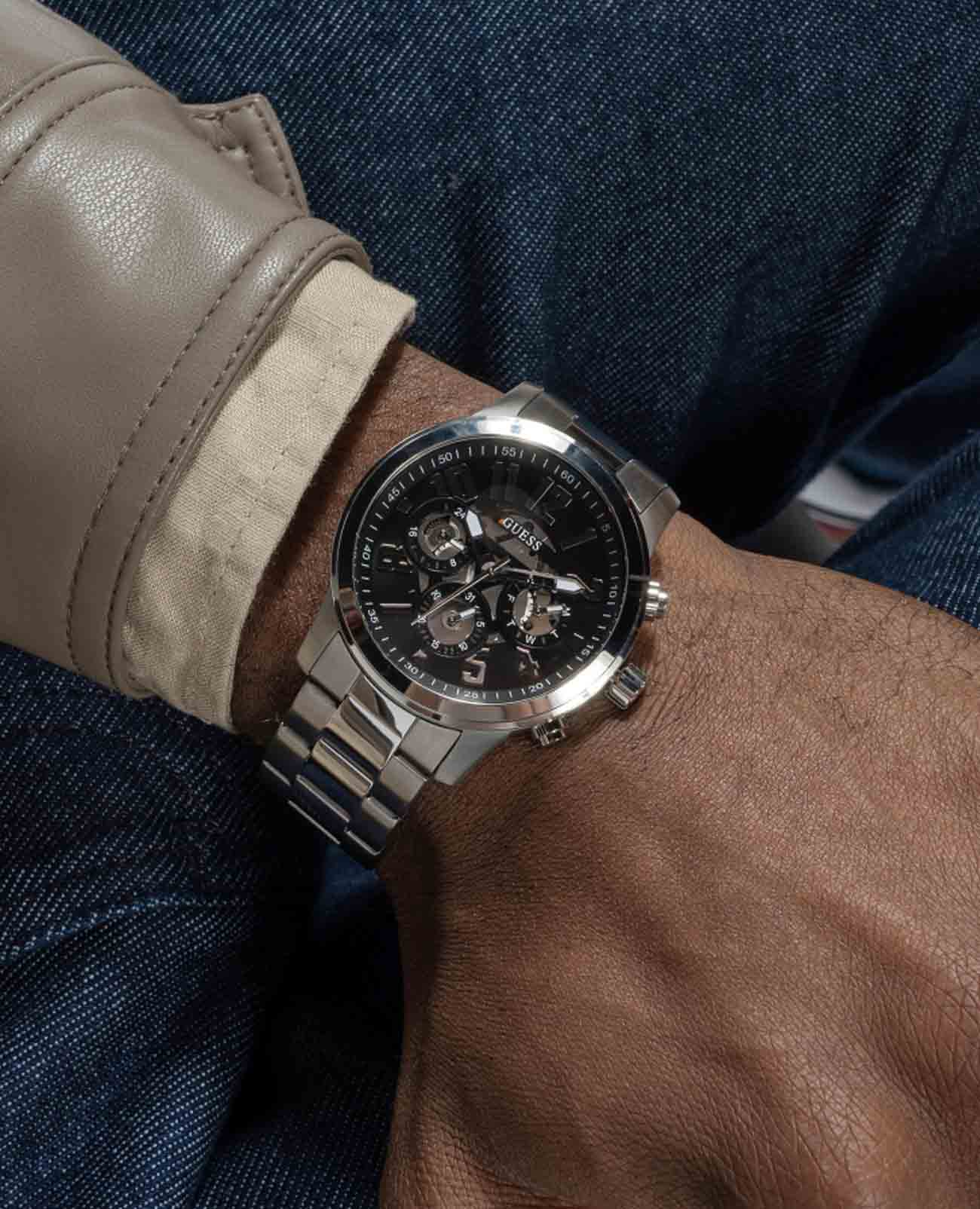 Мужские наручные часы с минеральным стекломМинеральное стеклоМинеральное стекло представляет собой искусственно выращенный минерал кварца. Такое стекло отличается особой устойчивостью к повреждениям и царапинам. Уступает по некоторым качествам сапфировому стеклу. Guess Dress GW0627G1, кварцевый механизм с высокой точностью. Корпус часов изготовлен из стали. 24-х часовой формат времени, число и день недели отображаются на отдельных циферблатах. Метки в виде арабских цифр. Рифленая заводная головка. Стрелки с люминесцентным покрытиемЛюминесцентное покрытиеПозволяет считывать показания времени в темноте. Производители наносят на стрелки, часовые индексы, безель или поверхность циферблата светонакопительный состав, дающий холодное свечение.. Класс водозащиты: 50 метров, позволит защитить корпус от случайных брызг или капель дождя. Стальной браслет на раскладной застёжкеРаскладная застёжкаТакой тип застёжки используется только на браслетах из металла. Она никогда не раскрывается полностью, происходит разделение на 2 и более частей. Раскладывающая застёжка снизит вероятность потери часов к минимуму..