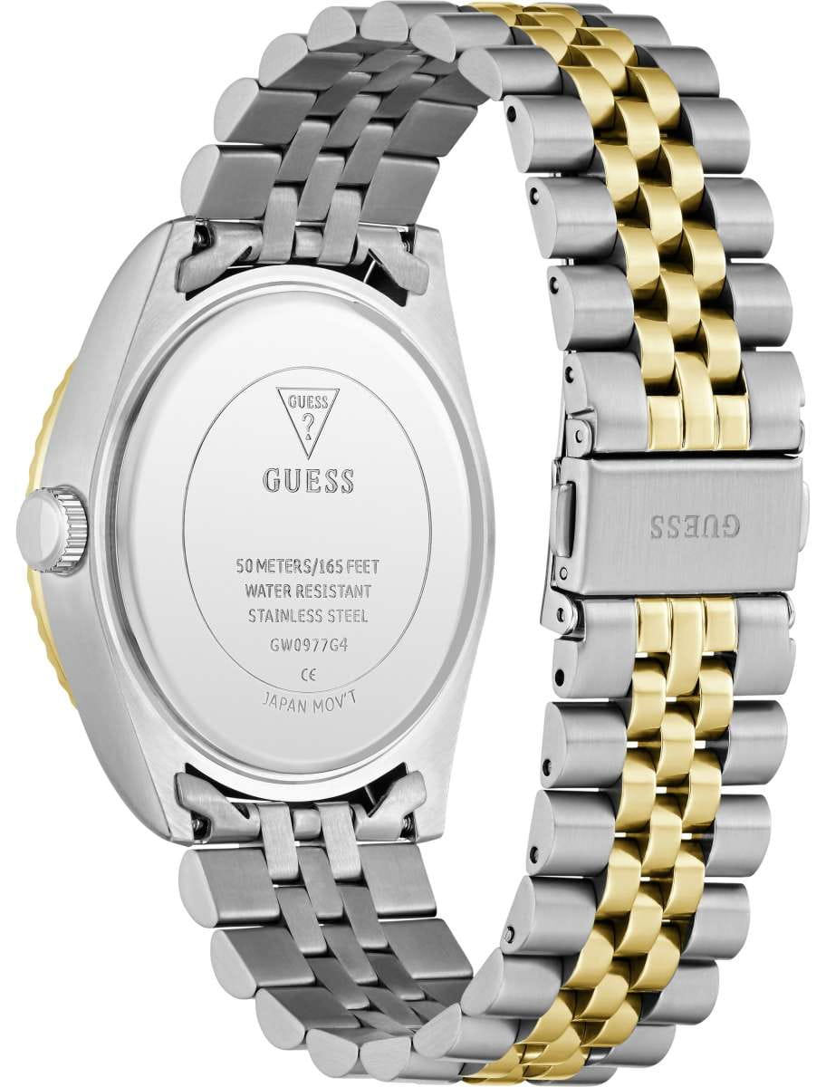 Мужские наручные часы Guess Dress Jaden GW0977G4 – это сочетание элегантности и современного стиля. Изысканные часы оснащены надежным кварцевым механизмом, который обеспечивает точность хода. Корпус часов выполнен из нержавеющей стали с безелемБезельВнешний ободок, закрепляющий стекло. В спортивных часах так называется поворотное кольцо с делениями на циферблате, выполняет роль таймера – замеряет отрезки времени на шкале. Неподвижный безель – элемент декора. Однонаправленно вращающийся безель на дайверских часах позволяет фиксировать моменты погружения и выныривания на поверхность. с IP-покрытиемIP-покрытиеМетод ионного напыления. Демонстрирует повышенную устойчивость к истиранию, окислению и химическим веществам. Под воздействием высокого давления и температуры около 1500°C молекулы металла надёжно соединяются с частицами корпуса часов. диаметром 42 мм и толщиной 11 мм, придающий модели особый характер. Циферблат оснащен метками в виде штрихов. Вынесенный циферблат с 24-х часовым указателем времени. Окошко даты в позиции 3 часов. Люминесцентное покрытиеЛюминесцентное покрытиеПозволяет считывать показания времени в темноте. Производители наносят на стрелки, часовые индексы, безель или поверхность циферблата светонакопительный состав, дающий холодное свечение. на стрелках и метках обеспечивает отличную видимость в темноте. Стильный стальной браслет с IP-покрытиемIP-покрытиеМетод ионного напыления. Демонстрирует повышенную устойчивость к истиранию, окислению и химическим веществам. Под воздействием высокого давления и температуры около 1500°C молекулы металла надёжно соединяются с частицами корпуса часов. с раскладной застежкойРаскладная застёжкаТакой тип застёжки используется только на браслетах из металла. Она никогда не раскрывается полностью, происходит разделение на 2 и более частей. Раскладывающая застёжка снизит вероятность потери часов к минимуму. гарантирует комфортное ношение и надежную фиксацию. Минеральное стеклоМинеральное стеклоМинеральное стекло представляет собой искусственно выращенный минерал кварца. Такое стекло отличается особой устойчивостью к повреждениям и царапинам. Уступает по некоторым качествам сапфировому стеклу. защищает циферблат от царапин, а водозащита 50WR предохраняет часы от случайных брызг и дождя. Эта модель станет отличным выбором для тех, кто ценит стиль и функциональность в одном аксессуаре.