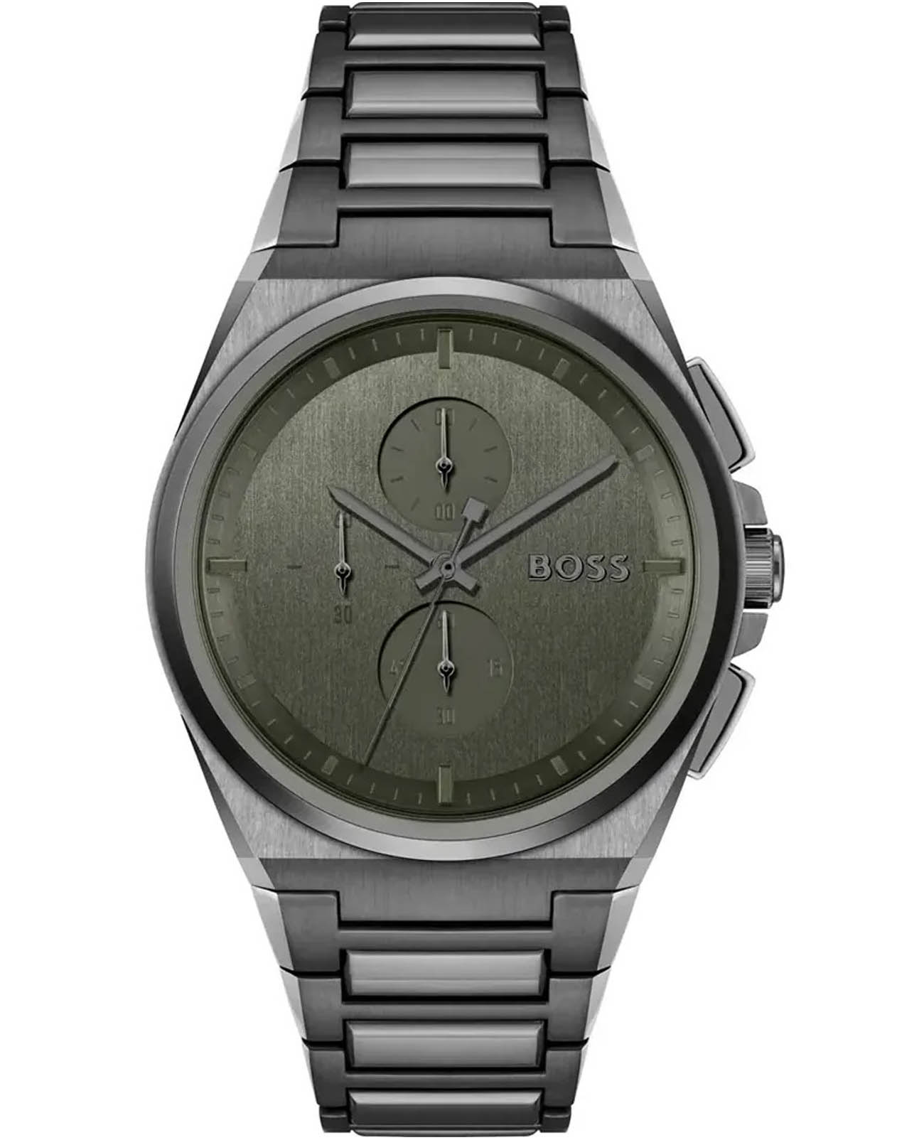 Мужские часы Hugo Boss Steer HB1514045 представлены в круглом 45,8-мм корпусе из нержавеющей стали с IP-покрытиемIP-покрытиеМетод ионного напыления. Демонстрирует повышенную устойчивость к истиранию, окислению и химическим веществам. Под воздействием высокого давления и температуры около 1500°C молекулы металла надёжно соединяются с частицами корпуса часов.. Оснащены кварцевым механизмом с функциями хронографаХронографФункция позволяет измерять отрезки времени с особой точностью: часы, минуты, секунды. Верным признаком хронографа является наличие на циферблате 3 дополнительных окошек-счётчиков., секундомеромСекундомерСекундоме́р — прибор, способный измерять интервалы времени с точностью до долей секунды.. Зеленый циферблат защищен устойчивым к царапинам минеральным стекломМинеральное стеклоМинеральное стекло представляет собой искусственно выращенный минерал кварца. Такое стекло отличается особой устойчивостью к повреждениям и царапинам. Уступает по некоторым качествам сапфировому стеклу.. Браслет из нержавеющей стали с IP-покрытиемIP-покрытиеМетод ионного напыления. Демонстрирует повышенную устойчивость к истиранию, окислению и химическим веществам. Под воздействием высокого давления и температуры около 1500°C молекулы металла надёжно соединяются с частицами корпуса часов. дополнен раскладной застёжкойРаскладная застёжкаТакой тип застёжки используется только на браслетах из металла. Она никогда не раскрывается полностью, происходит разделение на 2 и более частей. Раскладывающая застёжка снизит вероятность потери часов к минимуму.. Водонепроницаемость 50 метров (5 ATM) позволяет использовать часы для плавания.